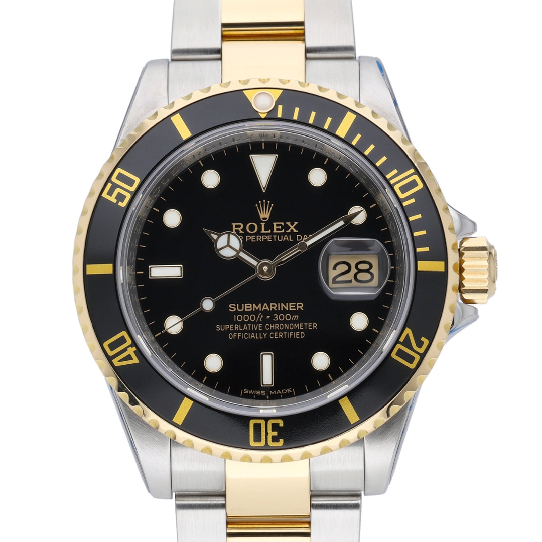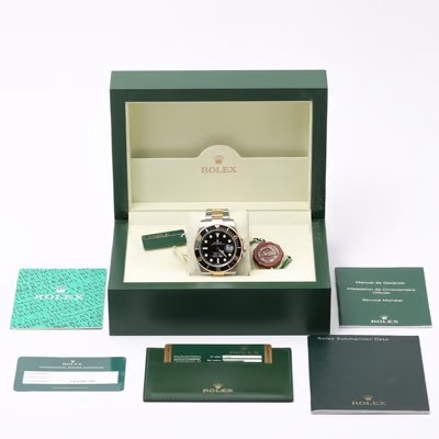 A bi-metal Rolex Submariner Date, crafted from stainless steel and 18ct yellow gold, fitted with a striking black dial and matching aluminium bezel insert. The combination of robust steel and rich gold has made the Submariner one of Rolex’s most iconic and desirable professional divers’ watches, admired for both its rugged utility and its timeless style.