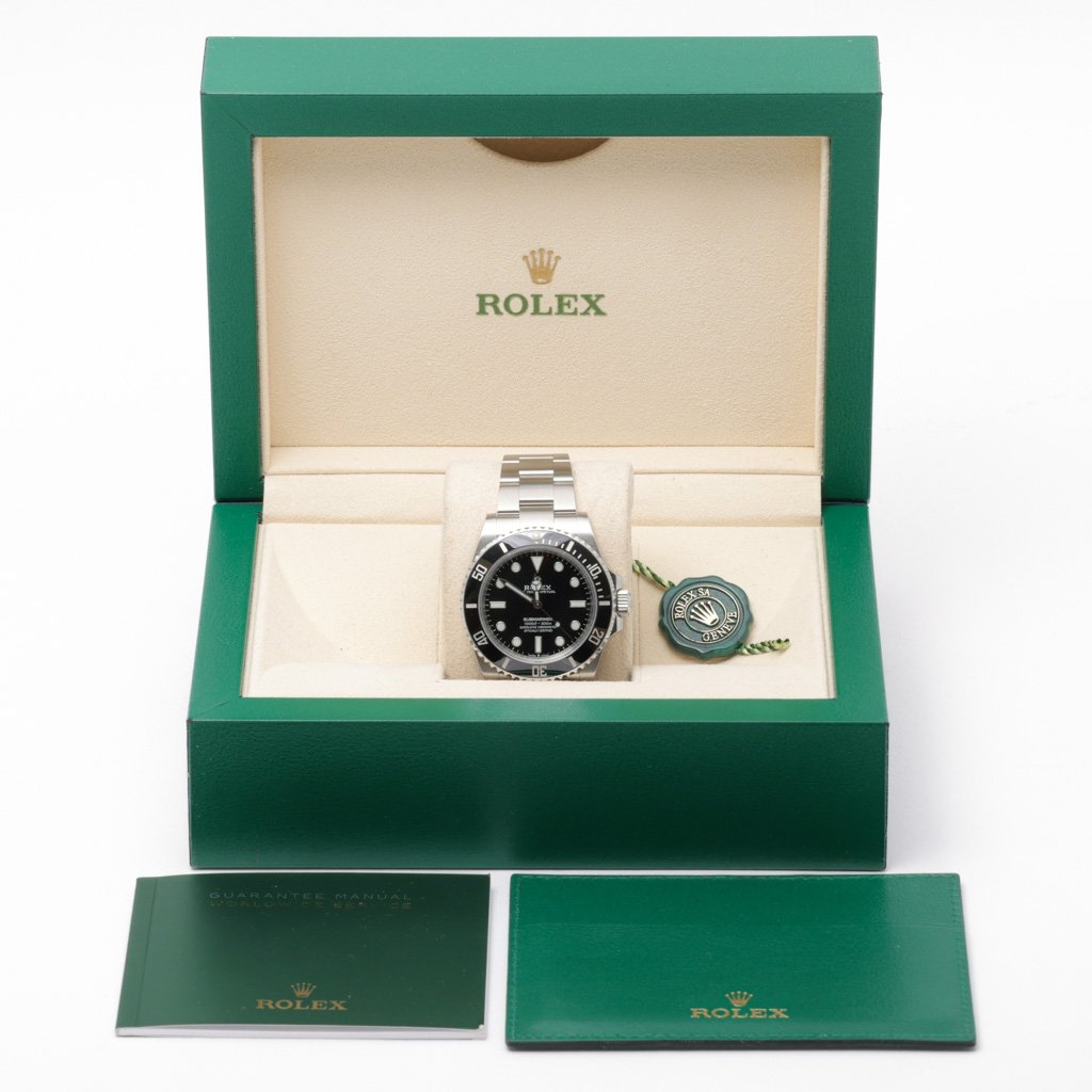 Produced in 2023, this Submariner is offered in immaculate condition and includes its original complete set of Rolex paperwork, box, and certification. Covered by the manufacturer's warranty until 2028, it represents a secure and enduring choice for collectors and enthusiasts. A true staple of the Rolex lineup, this reference blends heritage design with the latest in watchmaking technology.