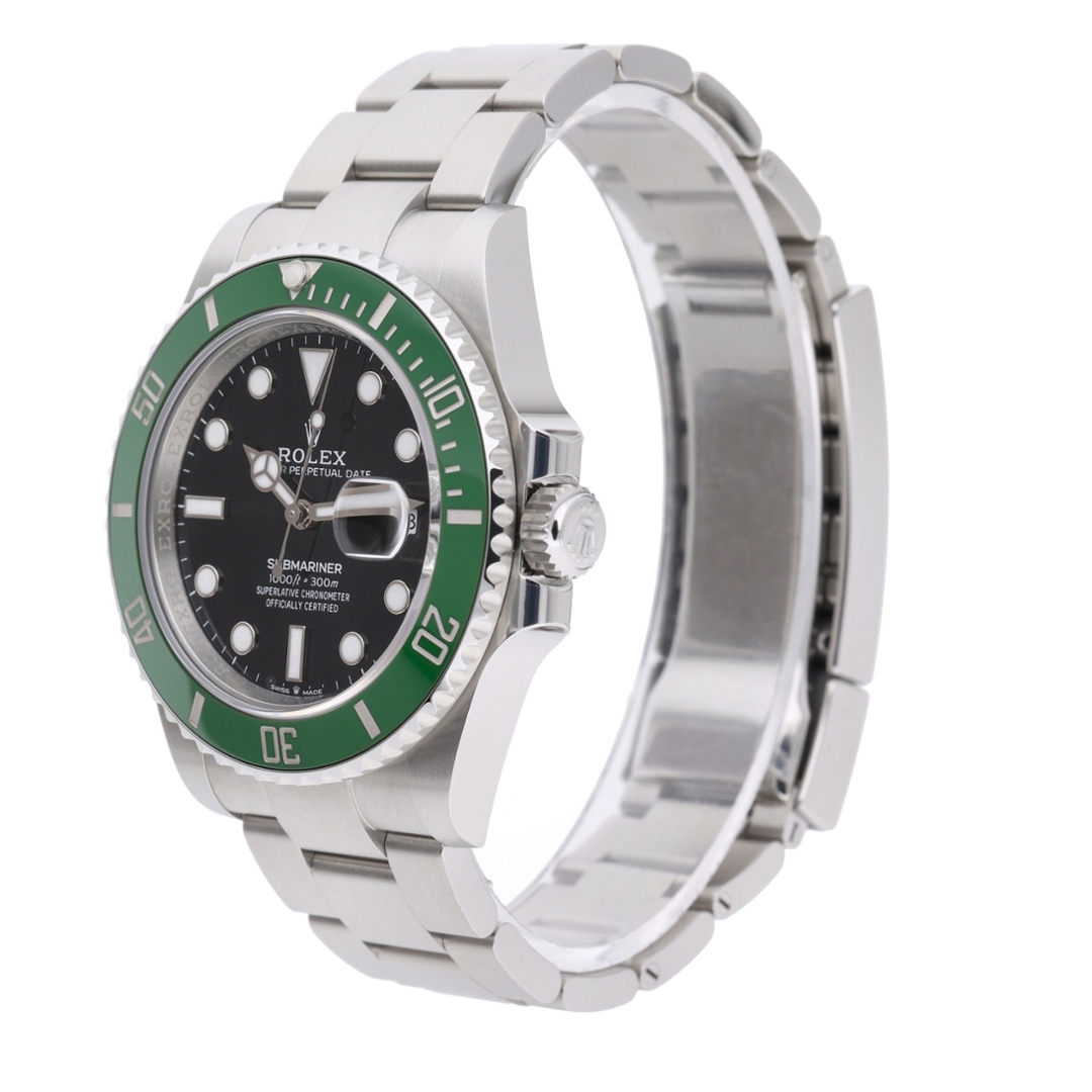 A Rolex Submariner Watch, Stainless Steel with a Green Bezel and Black Dial.