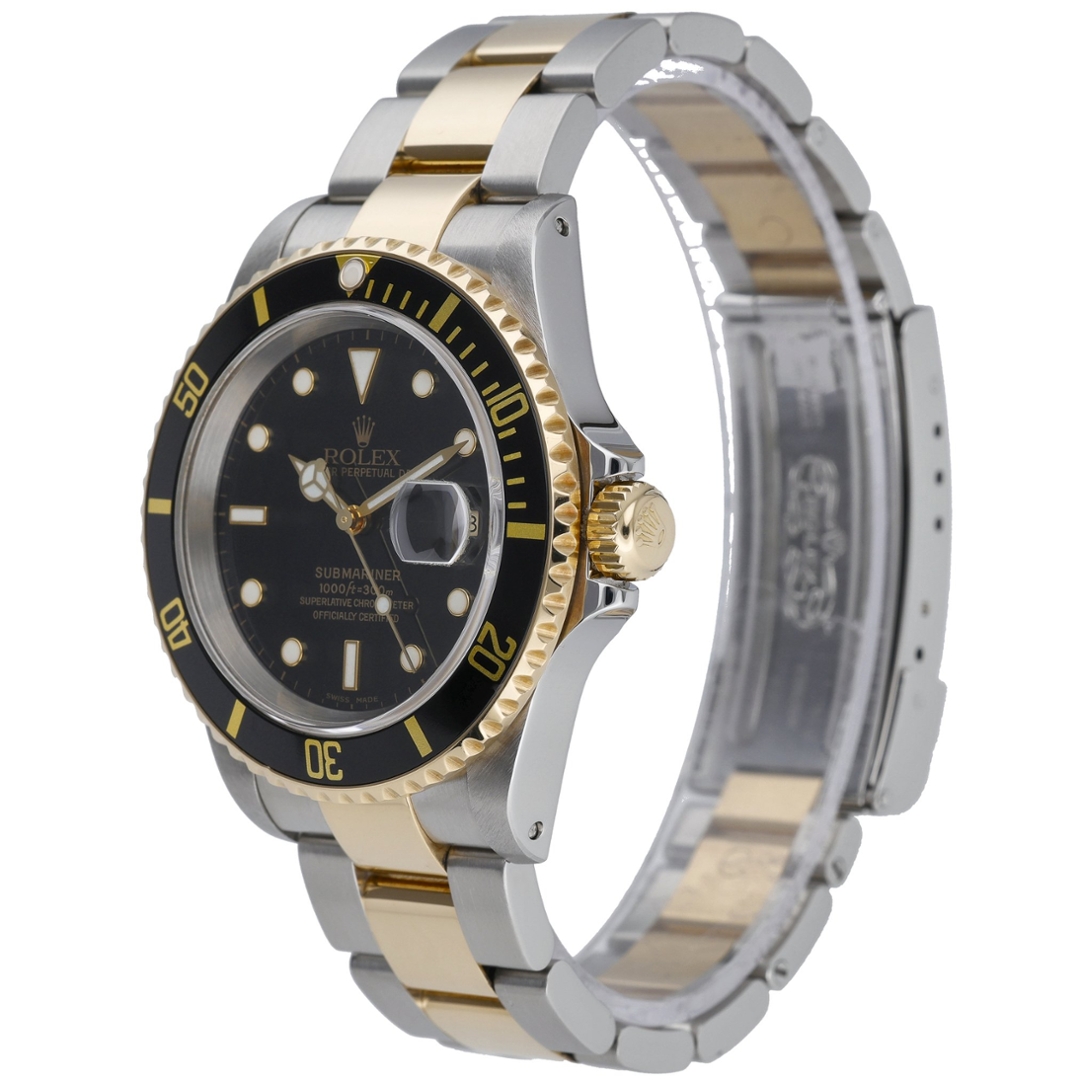 A Bi-Metal Rolex Submariner Watch that perfectly embodies the fusion of strength and sophistication, crafted from robust stainless steel and luxurious 18ct yellow gold. The striking combination is complemented by a deep black dial and matching black bezel, giving this timepiece its signature, timeless appeal. The luminous hour markers and hands ensure outstanding legibility in all conditions, while the 40mm case offers a bold yet balanced wrist presence suitable for any occasion.