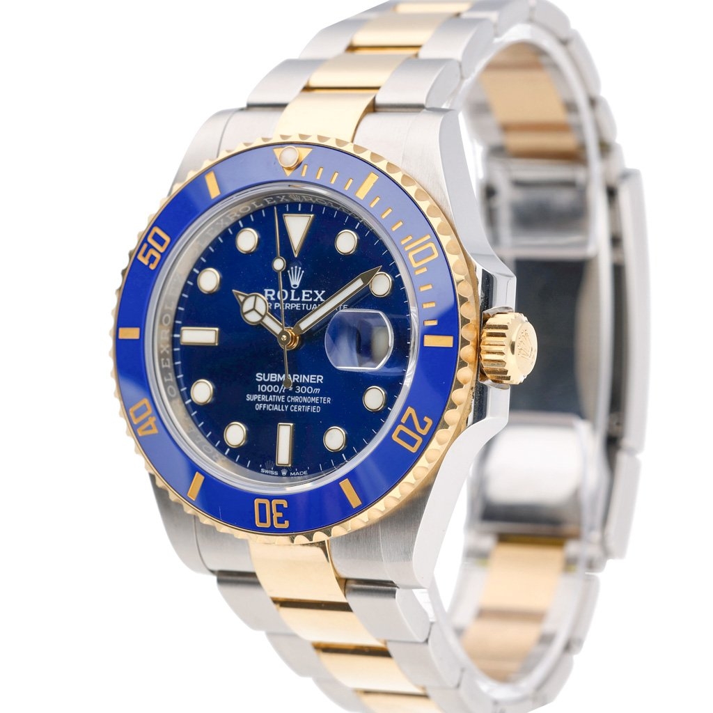 A Bi-Metal Rolex Submariner, model 126613LB, is an exceptional blend of professional dive capability and timeless luxury. Crafted from stainless steel and 18ct yellow gold, this 41mm model embodies Rolex’s mastery of design and engineering. The vibrant royal blue Cerachrom bezel and matching sunburst blue dial create a captivating visual harmony, enhanced by luminous hour markers and hands for superior readability in all lighting conditions. The iconic Oyster case and bracelet seamlessly combine durability with elegance, making this one of the most recognisable Submariners ever produced.