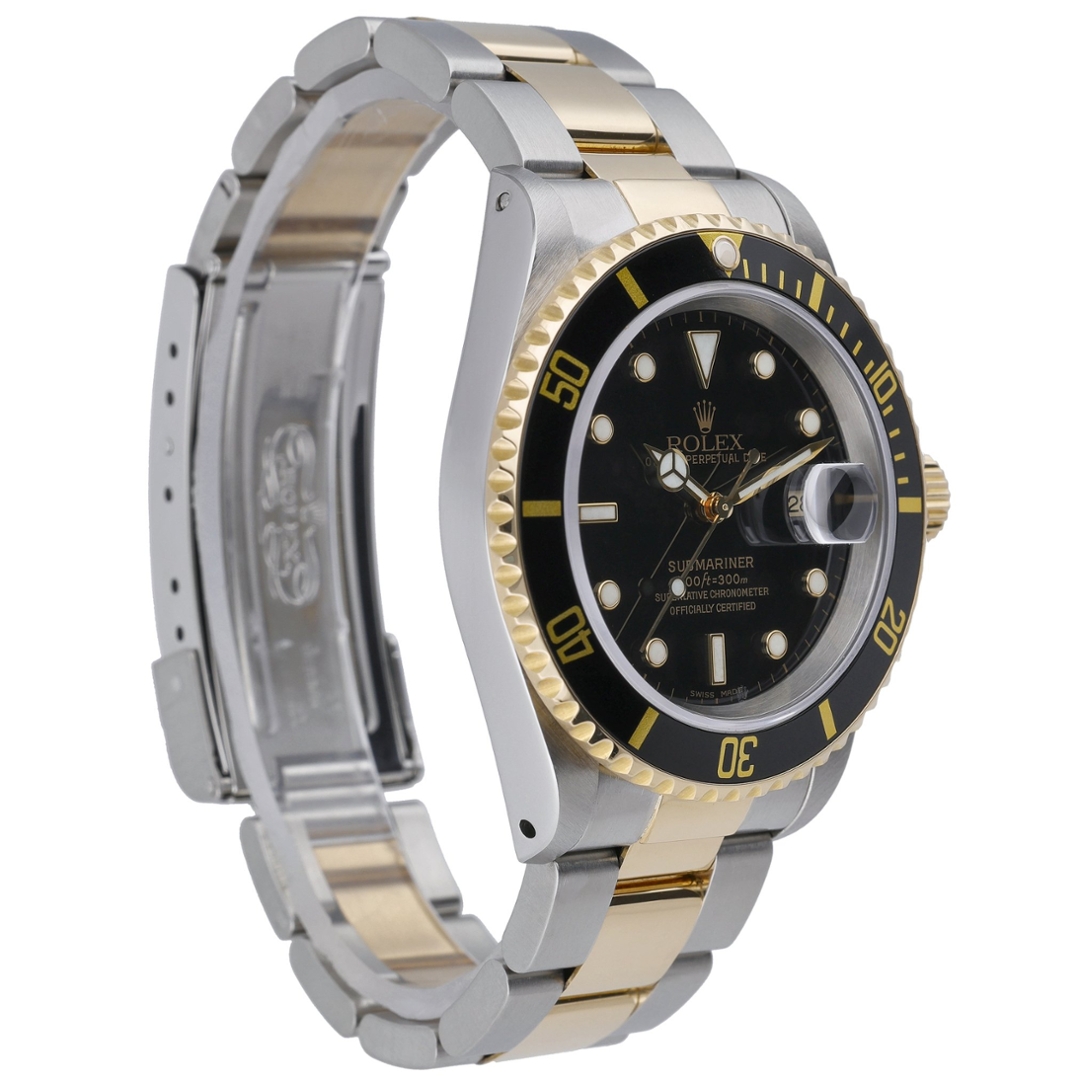 A Rolex Submariner 16613, released in 2000, is a classic example of the brand's legendary craftsmanship and timeless design. This particular model is a bi-metal variant, combining the strength of stainless steel with the luxury of 18ct yellow gold, creating a striking contrast that exudes both durability and elegance. The 40mm case is the perfect size, providing a substantial presence on the wrist without being overwhelming. Its black bezel and matching dial are both iconic and versatile, offering a sleek, refined appearance that suits any occasion.