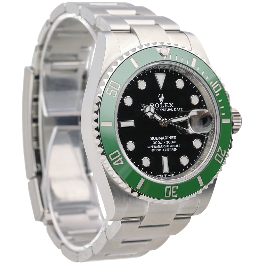 A Rolex Submariner Watch, model 126610LV, presented in immaculate condition. This 2025 reference combines stainless steel construction with the instantly recognisable green Cerachrom bezel and classic black dial, a modern evolution of the celebrated “LV” lineage. The 41mm Oyster case houses the Rolex Calibre 3235 automatic movement and is offered as a complete set, including the original box, paperwork, and the Rolex manufacturer's warranty remaining until 2030.