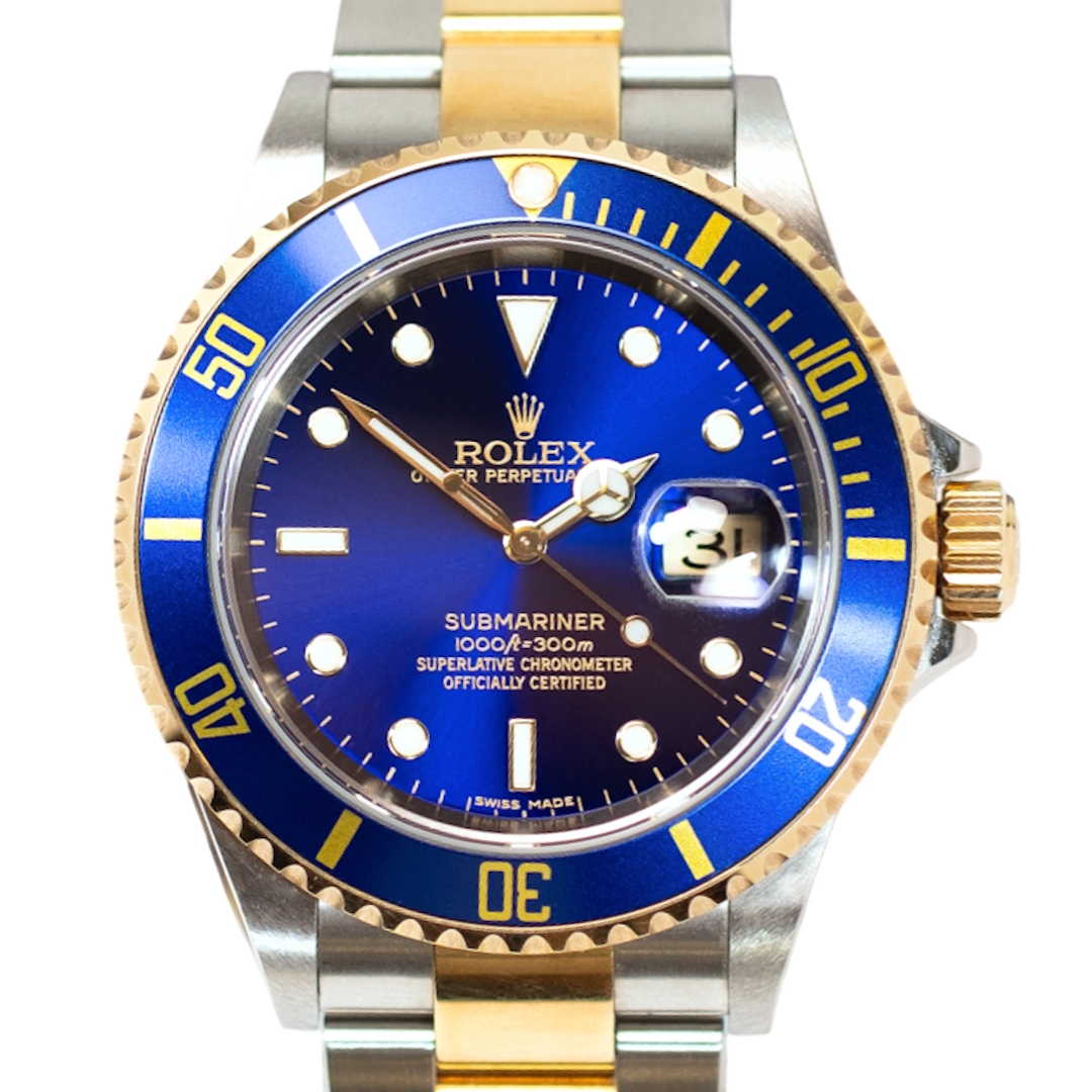 A Rolex Submariner 16613, crafted in striking bi-metal Stainless Steel and 18ct Yellow Gold, complete with its signature blue bezel and matching sunburst blue dial. This combination has become one of Rolex's most iconic and recognisable designs. This 2000 model embodies the perfect balance between sportiness and luxury, making it a standout choice for both collectors and enthusiasts alike.