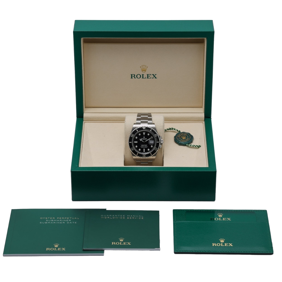 Presented in immaculate condition, this Submariner includes its original complete set of paperwork and the signature Rolex box, ensuring authenticity and prestige. Backed by a Rolex manufacturer's warranty valid until 2030, this timepiece offers unparalleled peace of mind. Elevate your collection with this extraordinary watch, a timeless icon that reflects Rolex's legacy and prestige.
