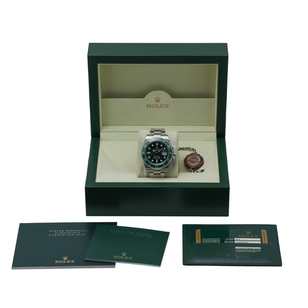 A Rolex Submariner reference 116610LV, often nicknamed the “Hulk,” is one of the most recognisable and collectable modern Submariner models ever produced. Crafted entirely from stainless steel, the 40mm case is paired with the instantly identifiable green Cerachrom bezel and matching green dial.