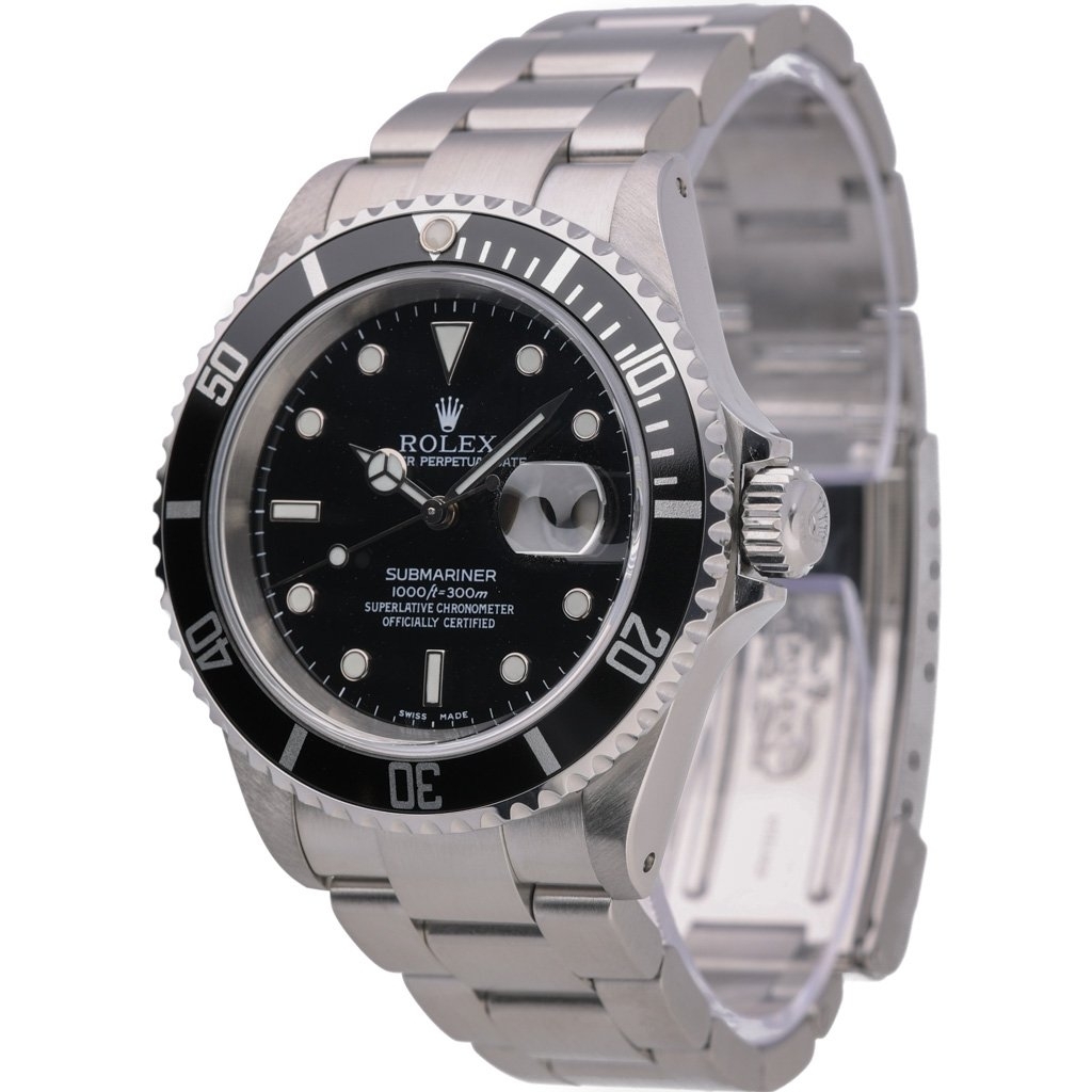 A Rolex Submariner watch, reference 16610, presented in immaculate condition. This 1993 example features a 40mm stainless steel Oyster case paired with a black aluminium bezel and ma atching black dial with luminous hour markers. Fitted to the classic Oyster bracelet, it is powered by the highly regarded Rolex Calibre 3135 automatic movement, renowned for its reliability and ease of service. The watch is supplied with original Rolex paperwork, boxed and certified, and covered by a 12-month WLC warranty.