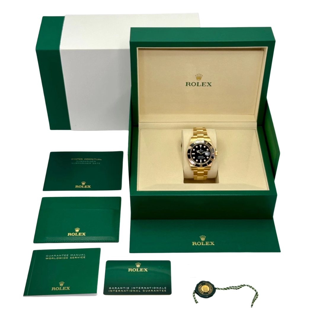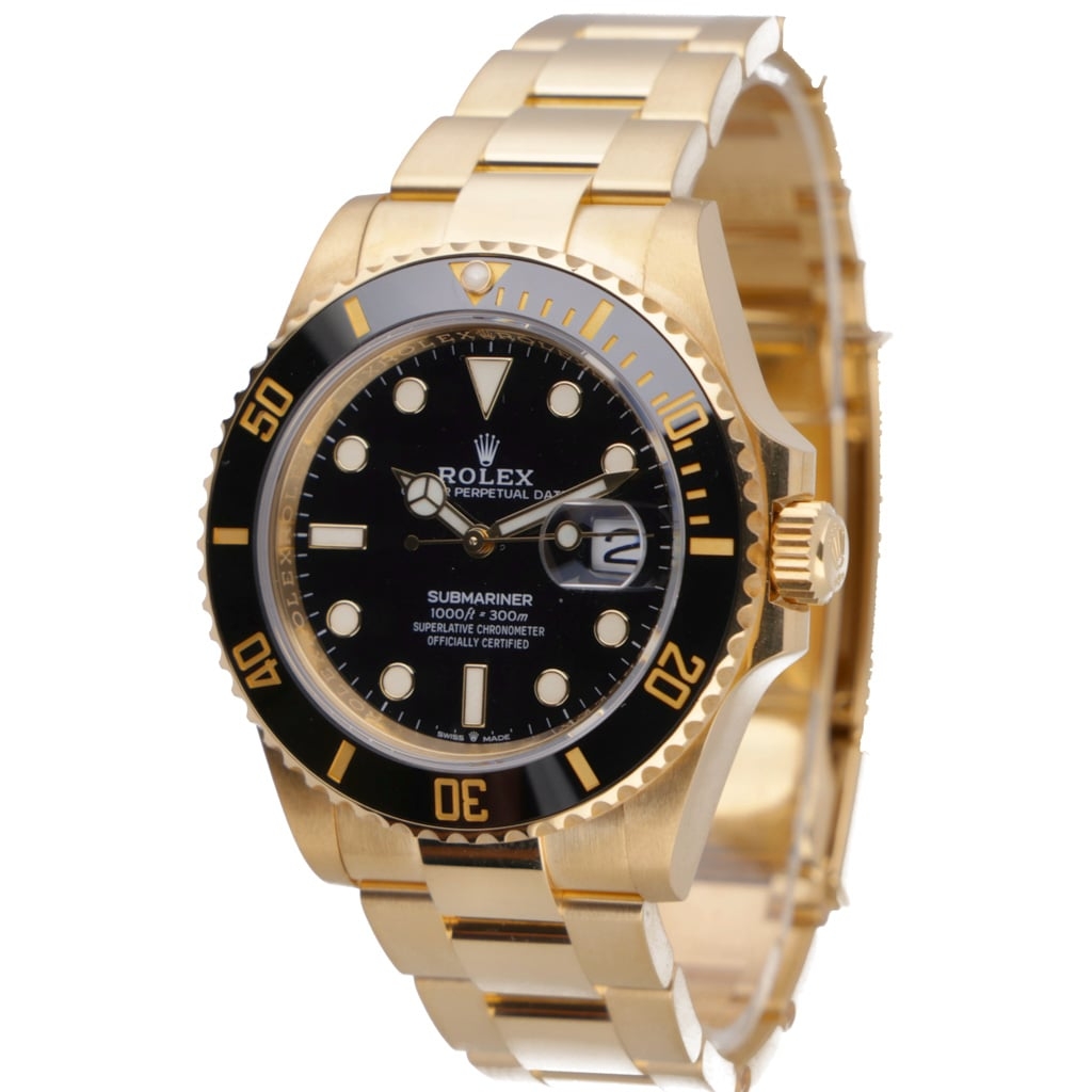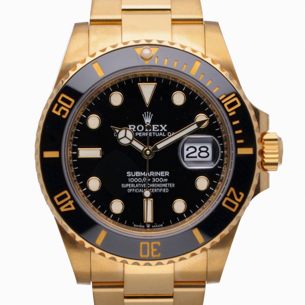 This Rolex Submariner reference 126618LN is crafted entirely in 18ct yellow gold, combining unmistakable presence with professional dive capability. The 41mm Oyster case is paired with a black Cerachrom bezel insert featuring gold numerals and graduations, while the black dial with luminous hour markers ensures exceptional clarity in all conditions. Fitted to the solid 18ct yellow gold Oyster bracelet, it delivers both weight and refinement on the wrist.