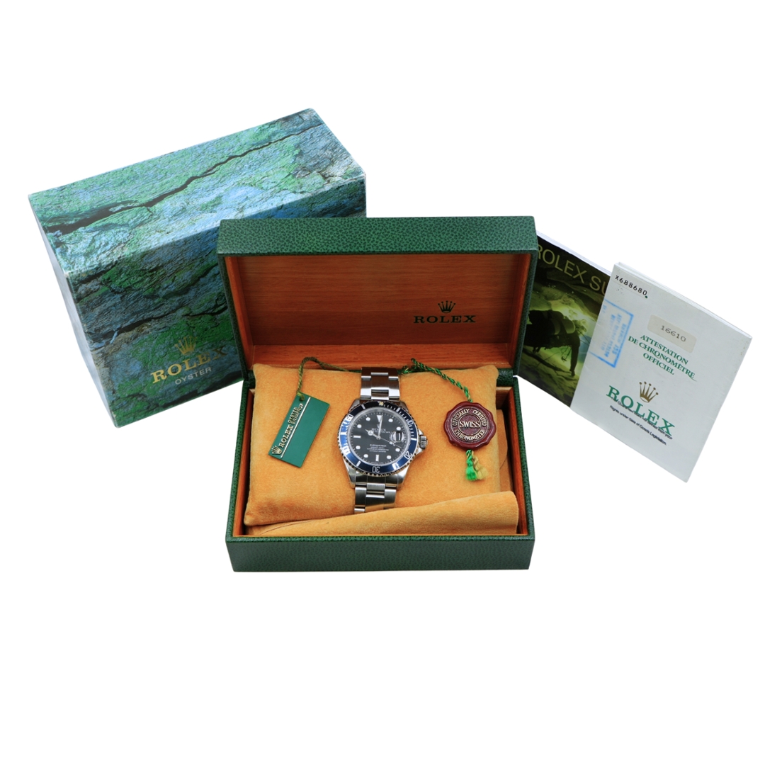 A Rolex Submariner watch, reference 16610, presented in immaculate condition. This 1993 example features a 40mm stainless steel Oyster case paired with a black aluminium bezel and ma atching black dial with luminous hour markers. Fitted to the classic Oyster bracelet, it is powered by the highly regarded Rolex Calibre 3135 automatic movement, renowned for its reliability and ease of service. The watch is supplied with original Rolex paperwork, boxed and certified, and covered by a 12-month WLC warranty.