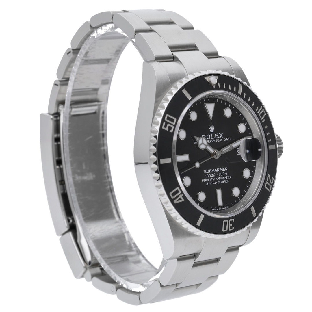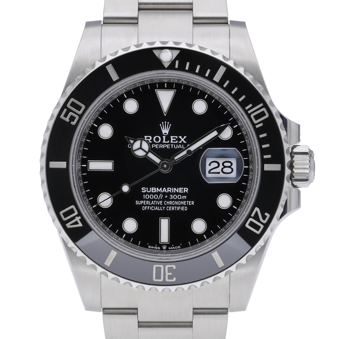 A Rolex Submariner 126610LN is presented in stainless steel with a black dial and a matching Cerachrom bezel, offering a clean, contemporary evolution of this iconic model. The 41mm Oyster case provides a slightly broader stance while retaining excellent balance on the wrist. Luminous hour markers, Mercedes hands and the Cyclops date window ensure strong legibility in all lighting conditions, while the unidirectional bezel adds practical functionality.