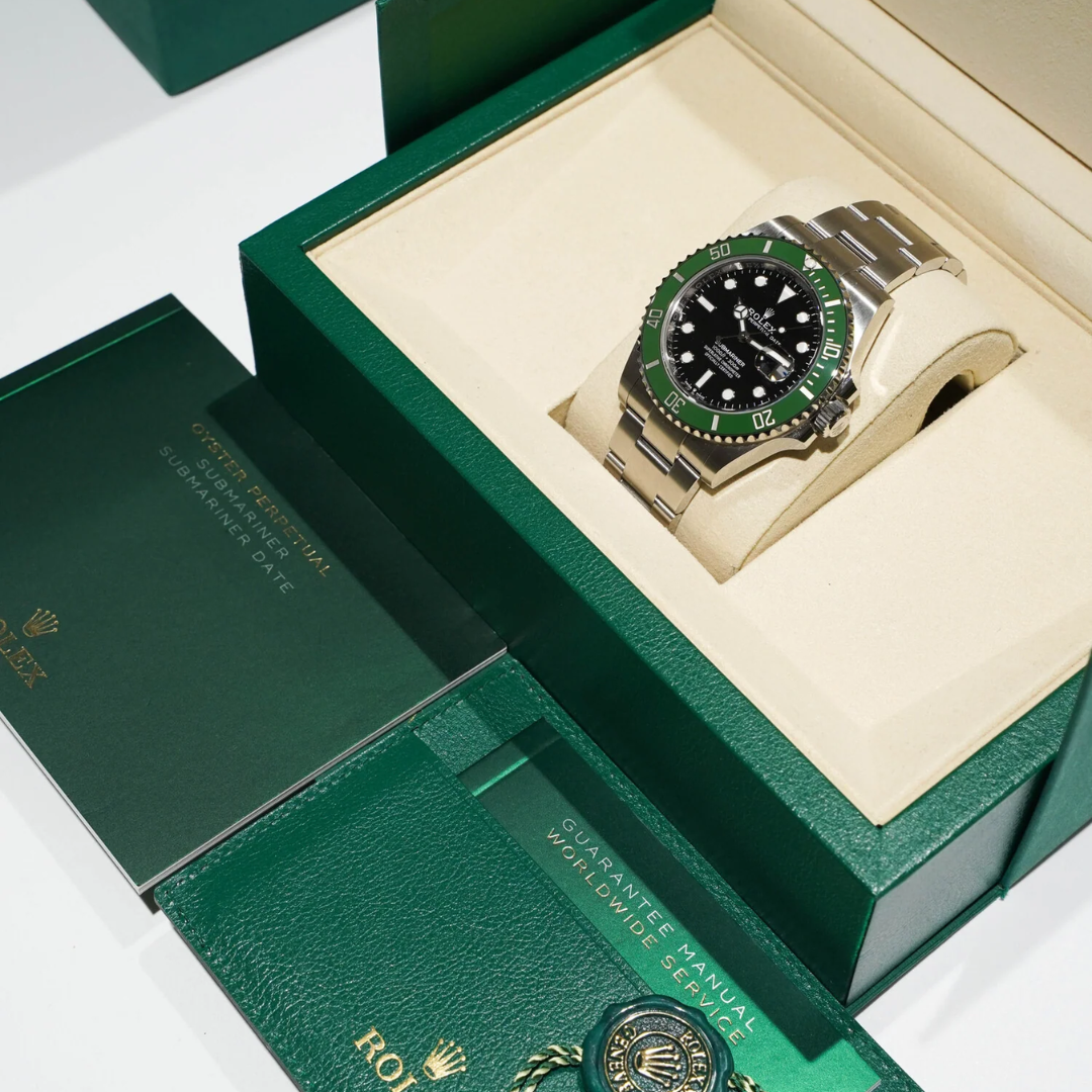 A Rolex Submariner Date reference 126610LV in stainless steel, featuring the striking green Cerachrom bezel paired with a classic black dial and Chromalight luminescent hour markers. Commonly known as the “Starbucks,” this modern variation offers a bold yet balanced aesthetic, combining contemporary Rolex design with the instantly recognisable Submariner profile in a refined 41mm case.