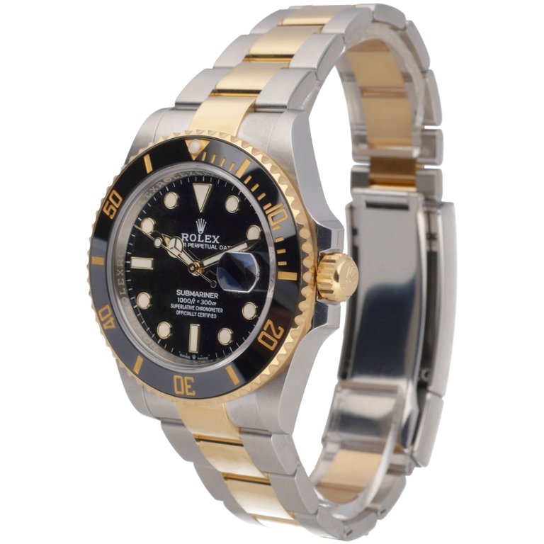 A Bi-Metal Rolex Submariner Watch is a highly sought-after Rolex Submariner, reference 126613LN, presented in a striking combination of stainless steel and 18ct yellow gold. The 41mm case is paired with a black ceramic bezel featuring gold numerals, delivering both durability and bold visual contrast. The black dial, complete with luminous hour markers and Mercedes hands, ensures exceptional legibility, while the date display at 3 o’clock is enhanced by the signature Cyclops lens.