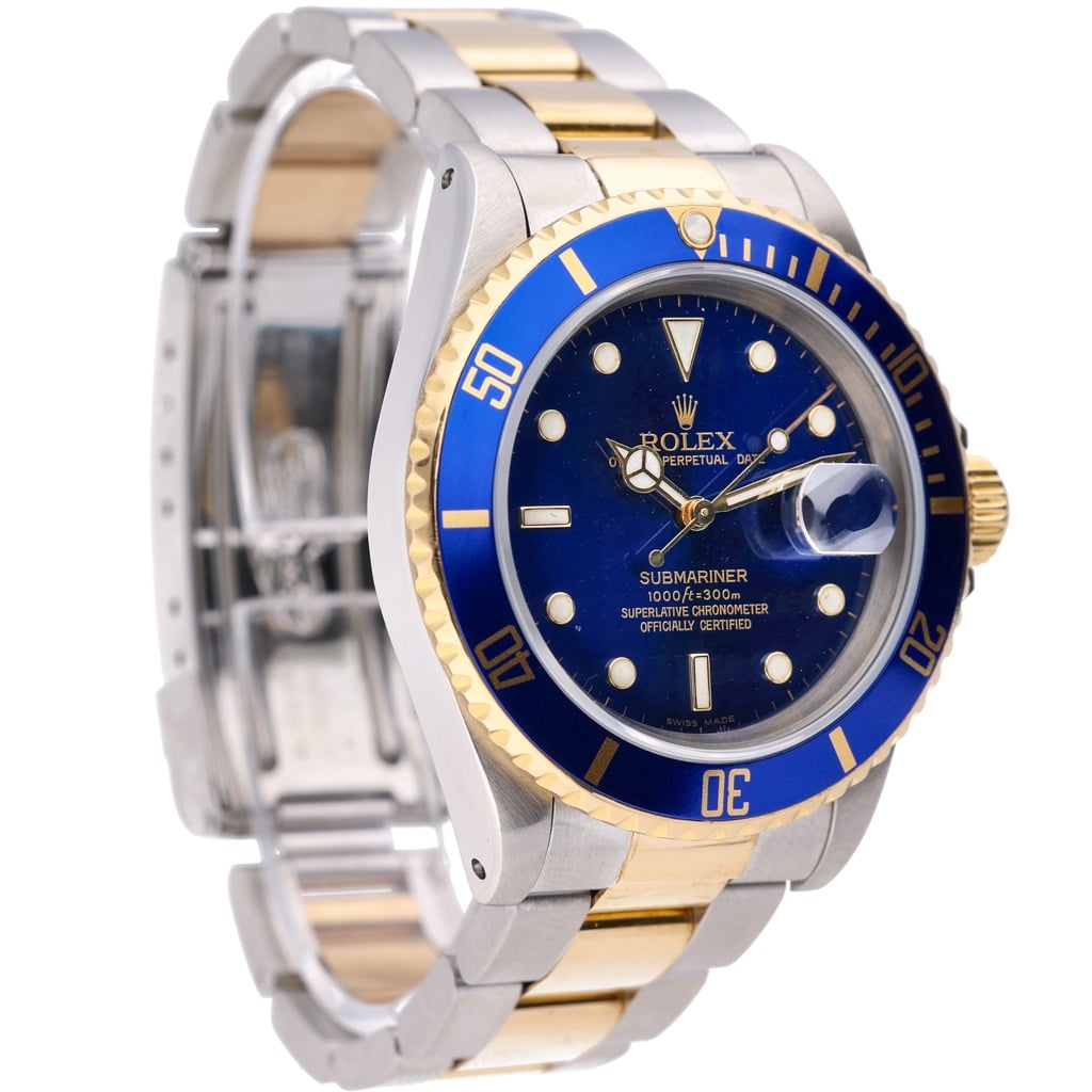 A Rolex Submariner reference 16613, crafted in stainless steel and 18ct yellow gold, featuring the iconic blue dial and matching bezel. This combination, often referred to as the “Bluesy,” delivers a distinctive and luxurious take on the traditional Submariner design. The 40mm case retains the era's balanced proportions, while the sunburst blue dial shifts beautifully in the light, complemented by gold accents that enhance both depth and presence.