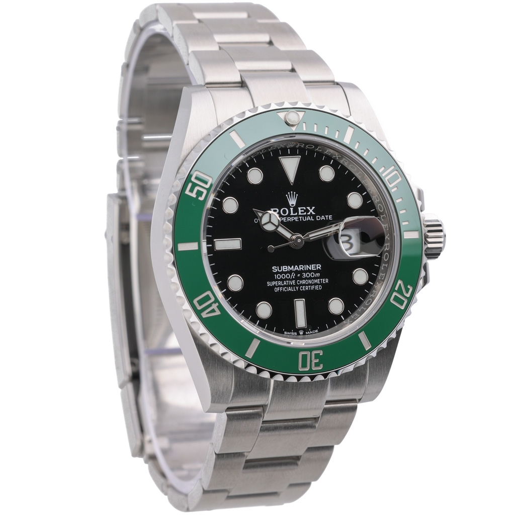 A Rolex Submariner Date 126610LV, crafted in stainless steel with a green ceramic bezel and contrasting black dial, is often referred to as the “Starbucks” within the watch community. This modern evolution of the classic Submariner introduces a refined case profile while retaining the iconic colour combination that has become one of the most recognisable in the range.
