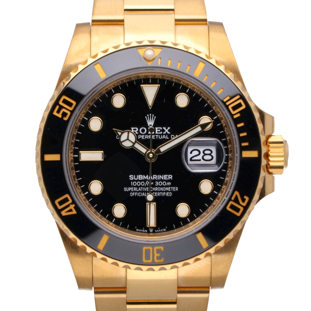 A Rolex Submariner reference 126618LN, crafted entirely in 18ct yellow gold and paired with a black dial and matching black Cerachrom bezel. The 41mm case represents the latest evolution of the Submariner, offering sharper proportions and a more refined wrist presence, while retaining the unmistakable DNA that has defined the model for decades. The contrast between solid-gold construction and the deep black dial creates a bold, high-impact aesthetic that immediately stands out.