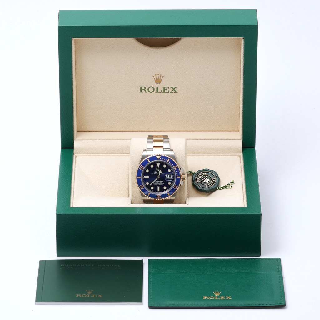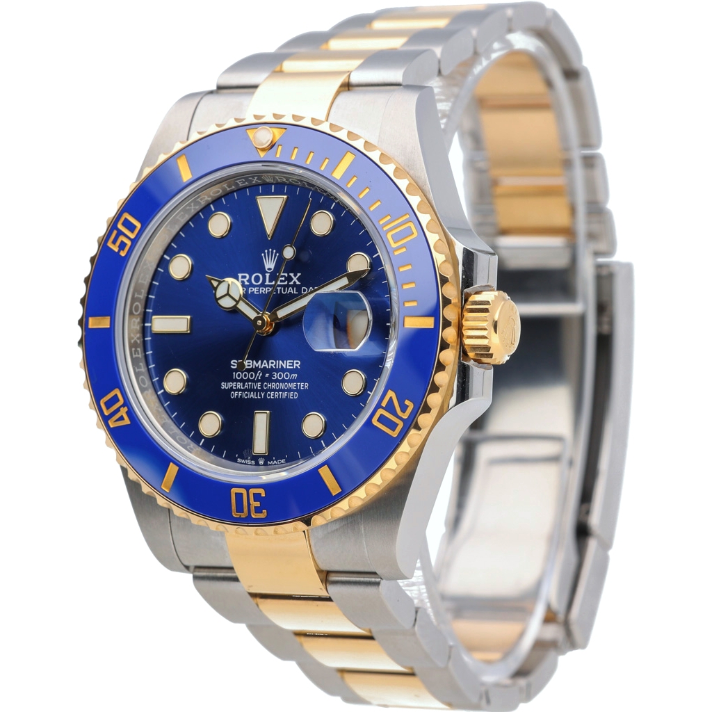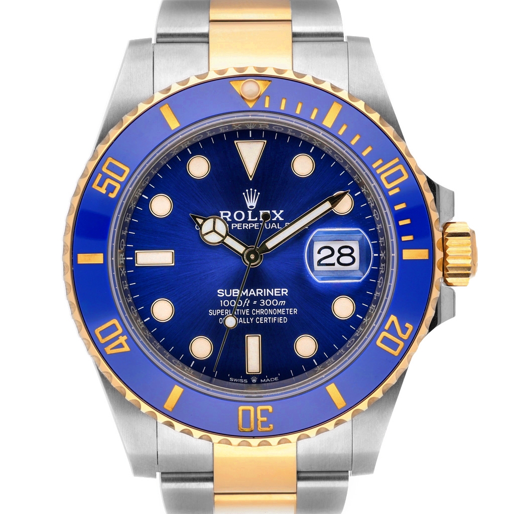 A bi-metal Rolex Submariner presents a bold and luxurious interpretation of one of Rolex’s most iconic professional dive watches. Crafted from stainless steel and 18ct yellow gold, the 41mm Oyster case offers a confident, modern presence on the wrist. The vibrant blue Cerachrom bezel is paired with a matching blue dial, creating a striking contrast against the gold accents. Luminous hour markers and Mercedes hands ensure exceptional legibility, while the Oyster bracelet completes the unmistakable Submariner profile.