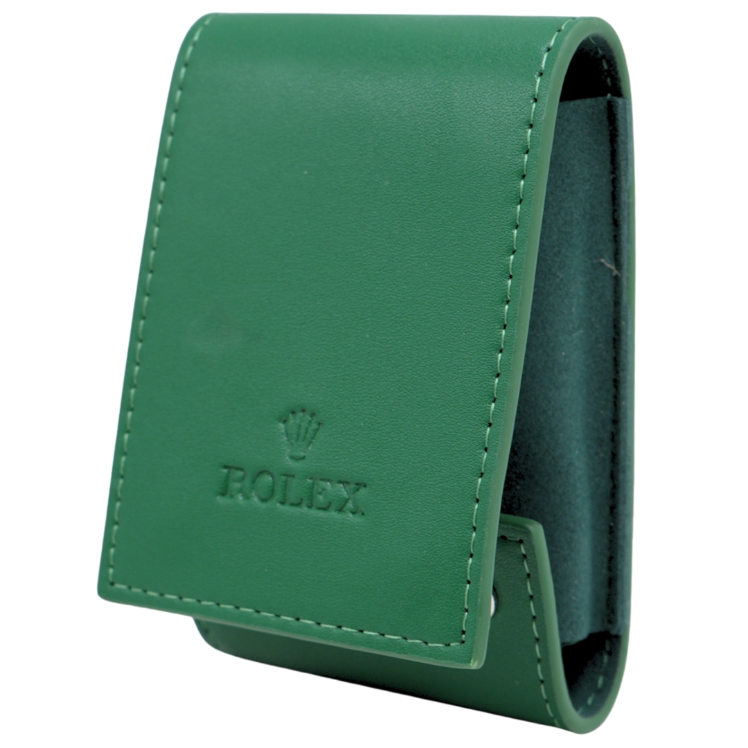 The Rolex travel case is the epitome of luxury and sophistication, designed for the discerning watch enthusiast. Crafted from premium materials, this case is enveloped in a rich, opulent green hue that immediately catches the eye. The front of the case proudly features the iconic Rolex logo, meticulously embossed to exude elegance and class.