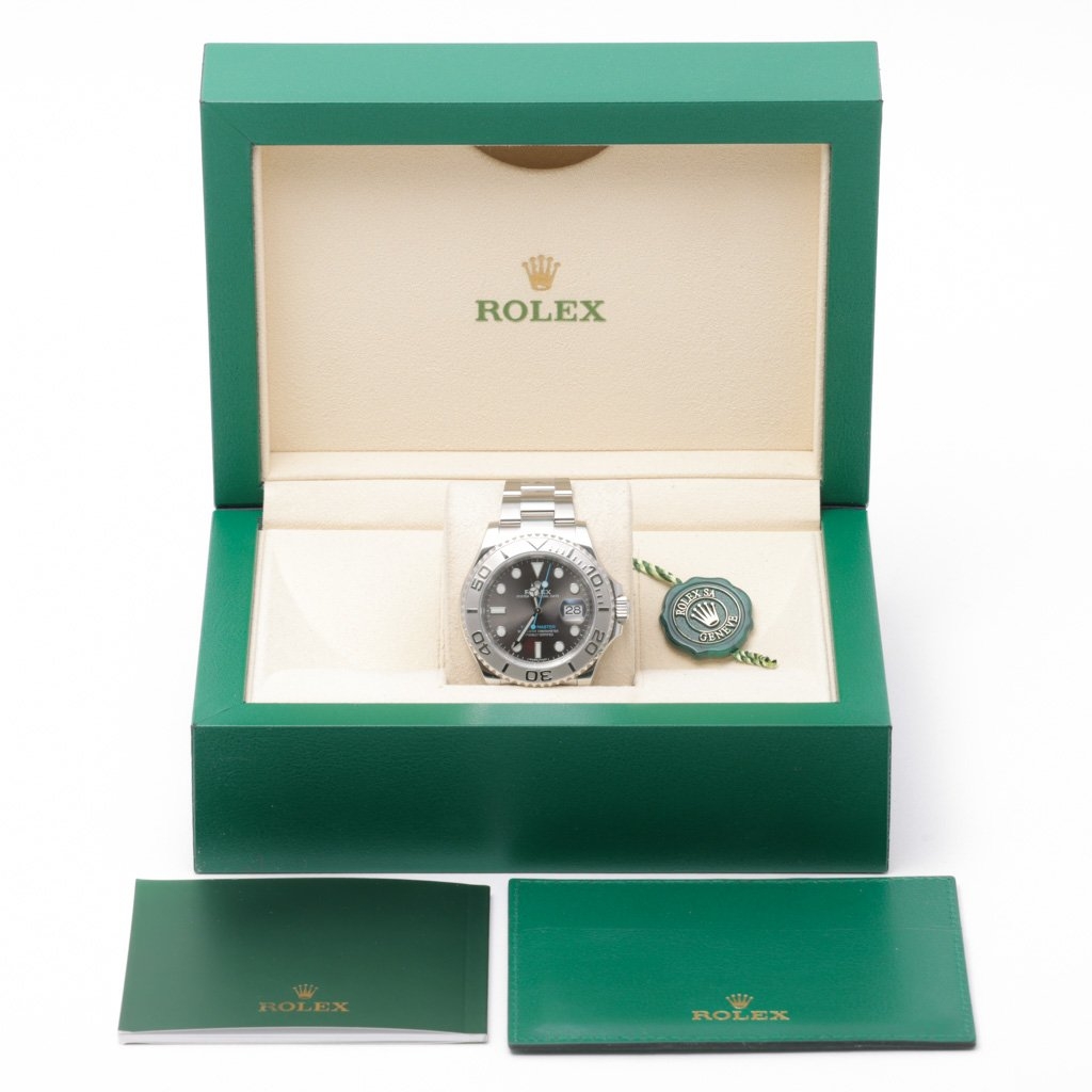A Rolex Yacht-Master 40, model 116622, crafted from stainless steel and featuring a solid platinum bezel, embodies the perfect blend of sporty sophistication and luxury performance. This 2019 example showcases the highly coveted rhodium dial, enhanced by a vivid blue seconds hand and the bold “Yacht-Master” inscription — a colour combination that has become one of the most desirable within the collection.