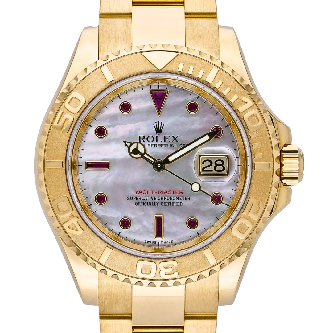 A Rolex Yacht-Master 40 Watch in full 18ct yellow gold, presented in immaculate condition, offering a striking and luxurious take on this iconic nautical model. The 40mm case is paired with a matching Oyster bracelet, giving the watch a strong yet refined presence on the wrist. The white mother-of-pearl dial is elevated by vibrant ruby-set hour markers, delivering a rich contrast against the gold case while maintaining excellent legibility and a distinctive aesthetic.