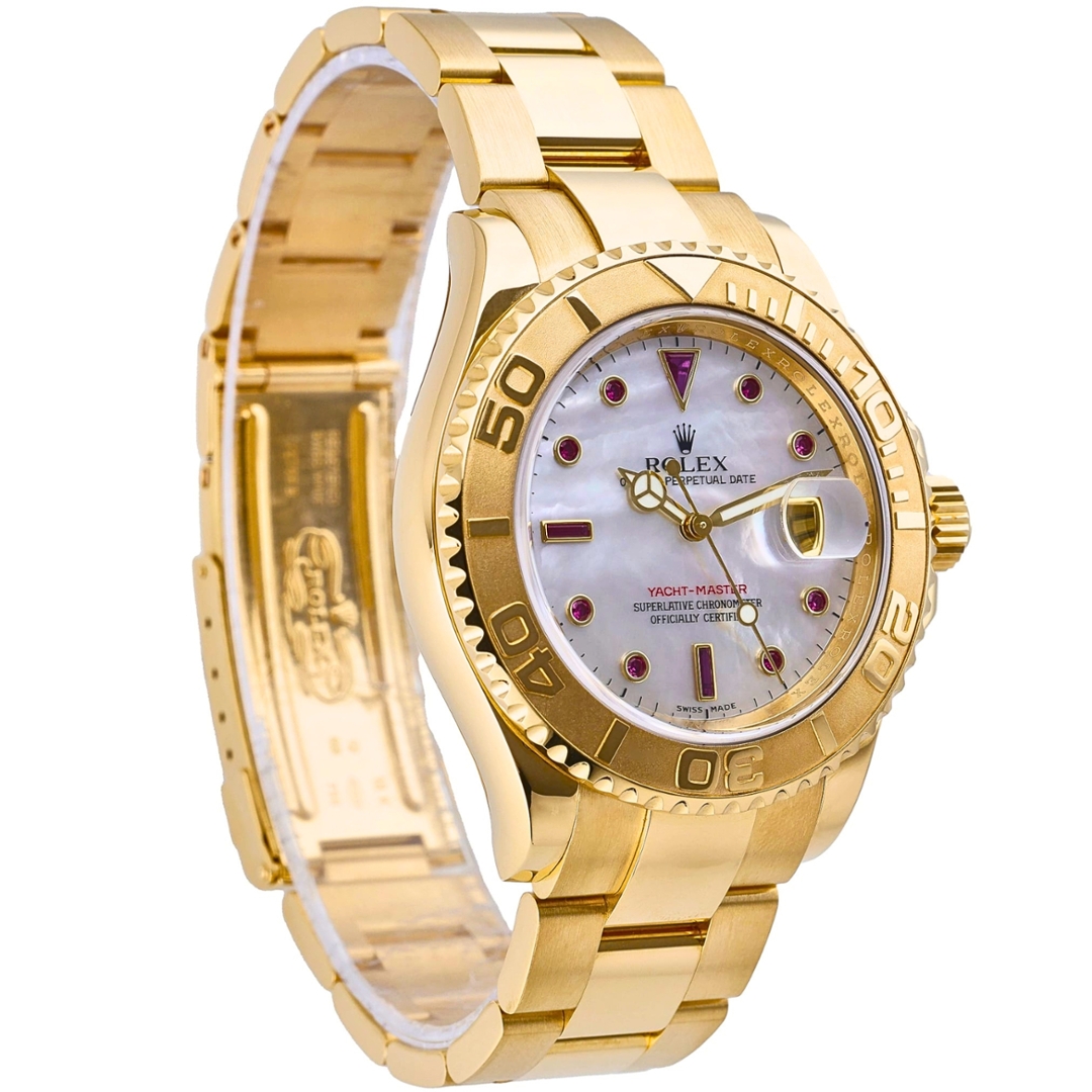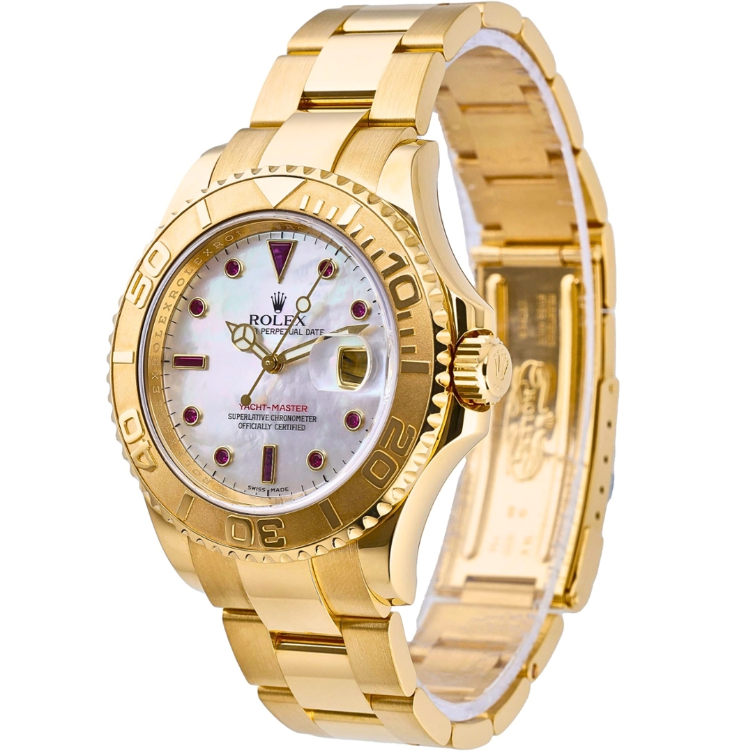 A Rolex Yacht-Master 40 Watch, Full 18ct Yellow Gold on a White Mother-of-Pearl Dial with Ruby Numerals