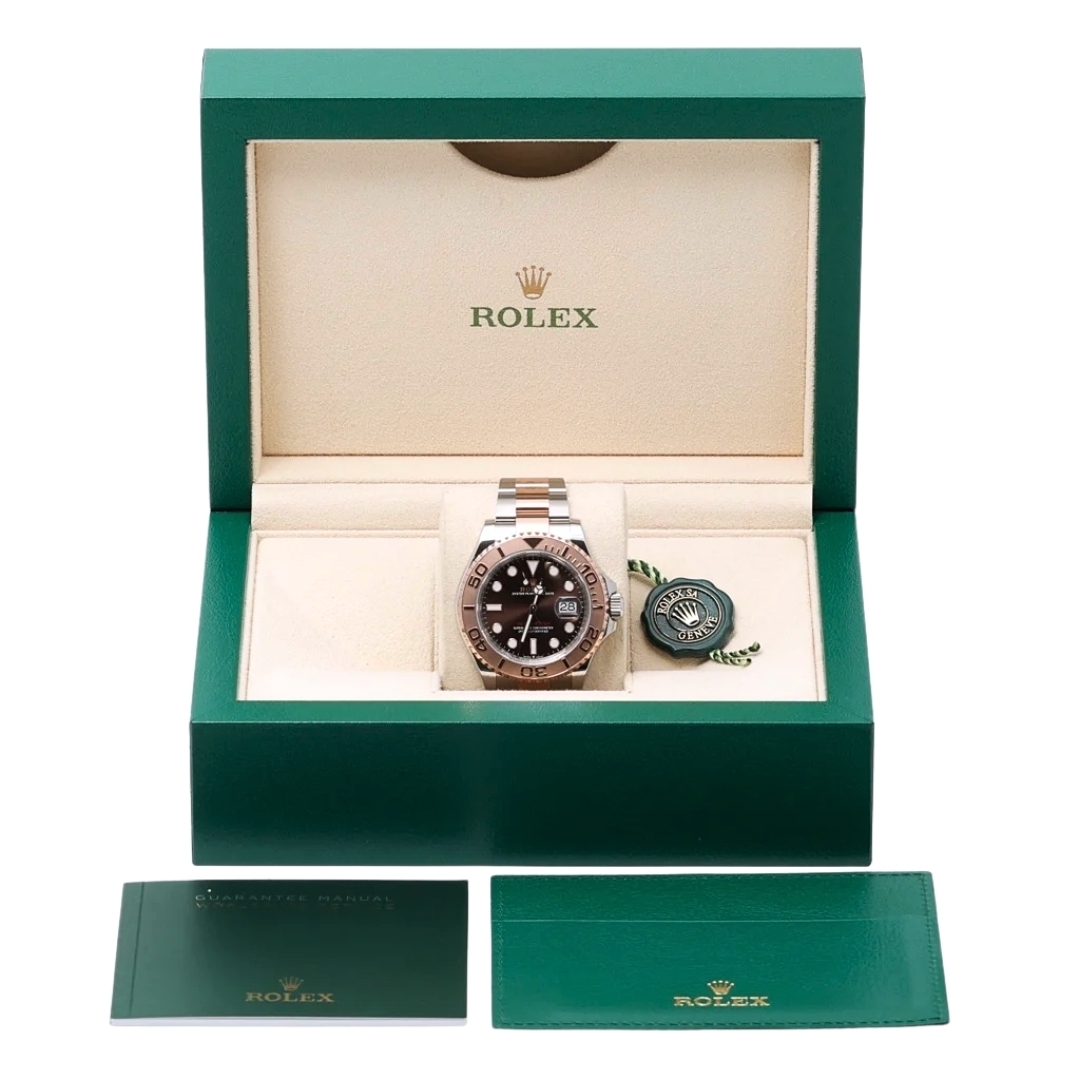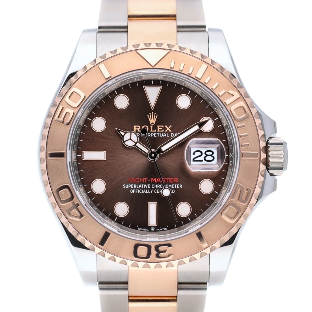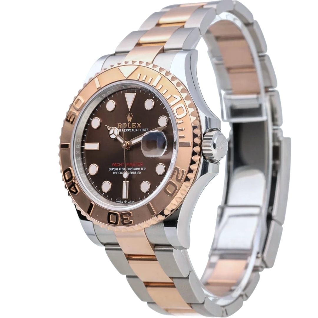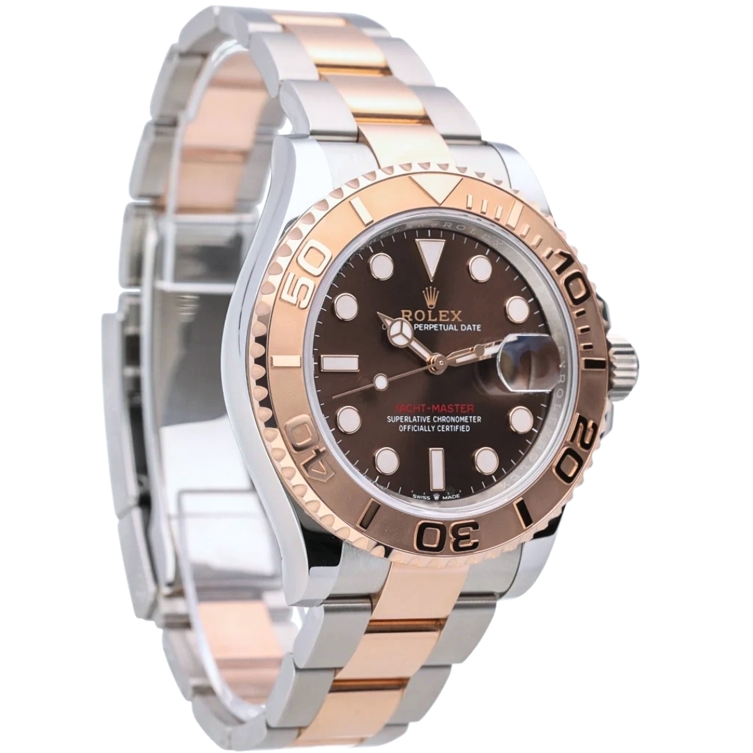 A Rolex Yacht-Master 40 model 126621 is a timepiece that epitomises luxury and precision. This exquisite watch features a 40mm case crafted from a harmonious blend of stainless steel and 18ct Everose gold, a proprietary rose gold alloy developed by Rolex. The combination of these materials not only enhances the watch's durability but also lends it a striking, sophisticated appearance. The watch is further distinguished by its captivating chocolate dial, which provides a rich contrast to the Everose gold hour markers and hands.