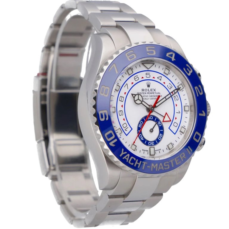 The Yacht-Master II's allure is further accentuated by its striking blue bezel, which evokes the boundless expanse of the open sea. The pristine white dial exudes elegance reminiscent of ocean waves breaking against the shore. Powered by an automatic movement, this masterpiece seamlessly blends style with functionality, ensuring precision and reliability in every moment.