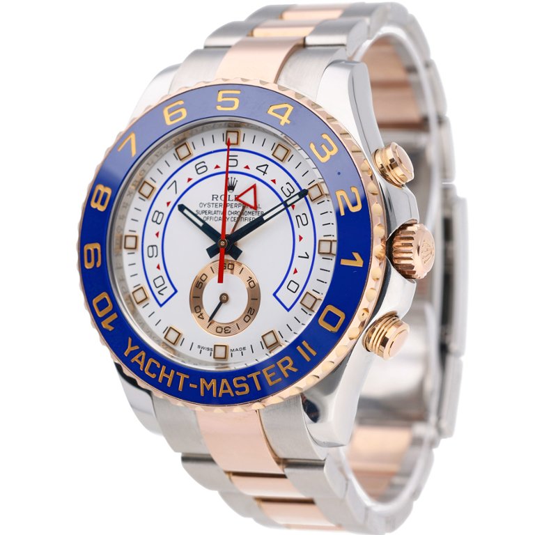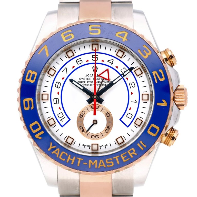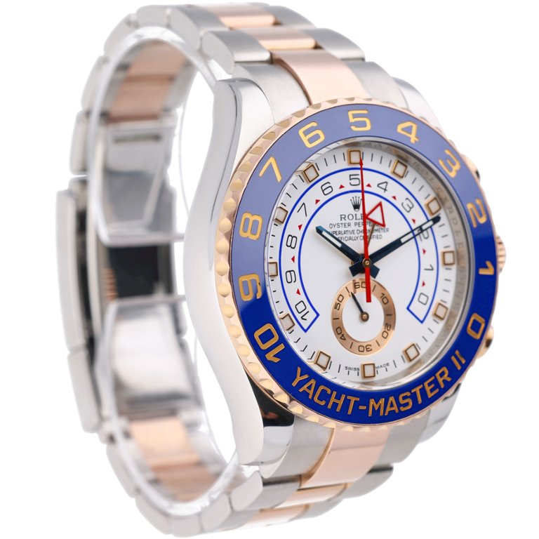 A Rolex Yacht-Master II reference 116681 in stainless steel and 18ct Everose gold, presented boxed and certified with its original full set of Rolex paperwork. The substantial 44mm case delivers strong wrist presence, combining professional regatta functionality with unmistakable Rolex finishing and design authority.