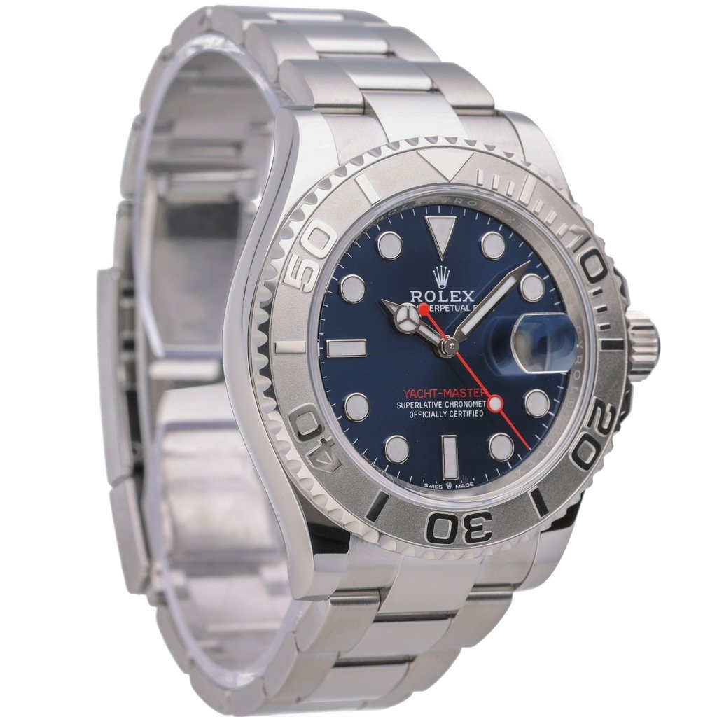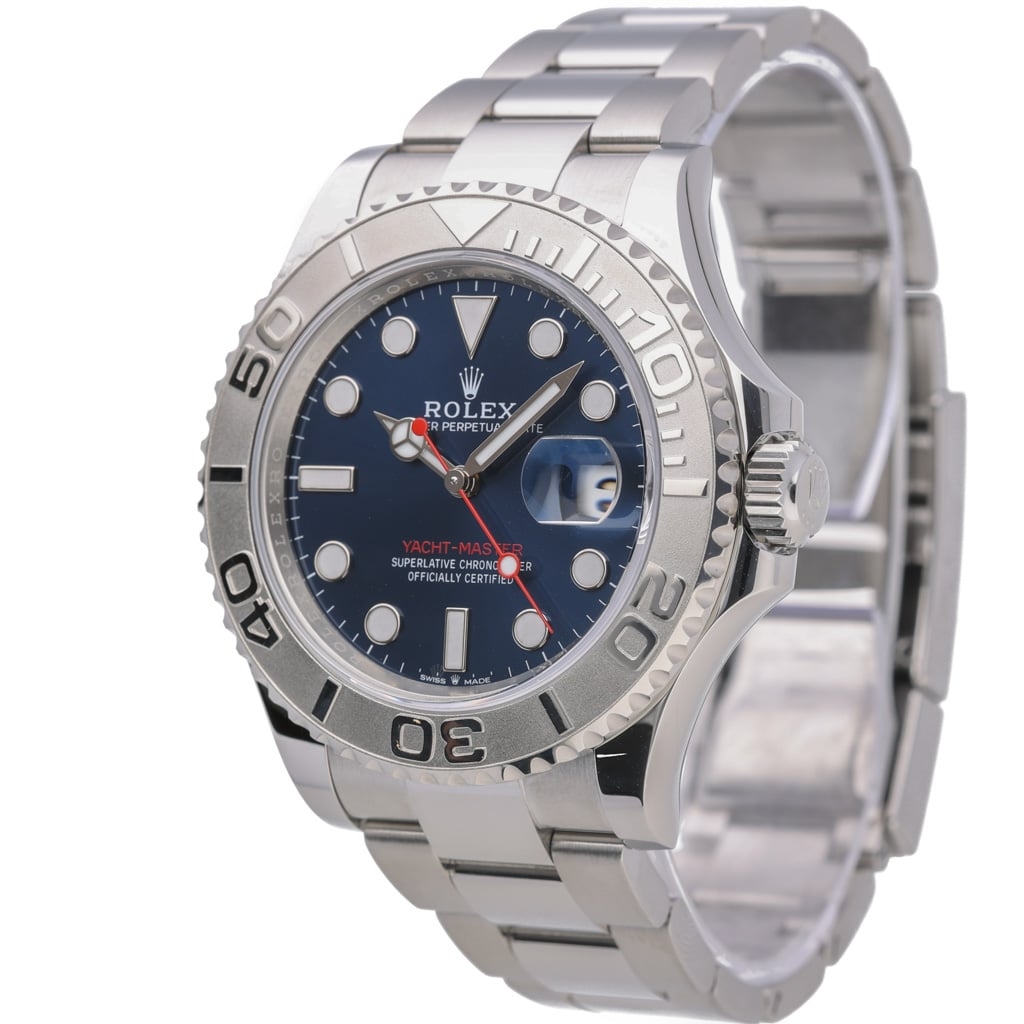 A Rolex Yacht-Master 126622, this 40mm stainless-steel model with its platinum bezel remains one of the most sought-after configurations in the modern Rolex sports range. The striking blue dial — a signature feature of this reference — delivers excellent legibility and a distinctive presence, further strengthening collector demand. With its blend of luxury materials and maritime-inspired design, it stands out as a reliable long-term choice for buyers seeking both performance and investment appeal.