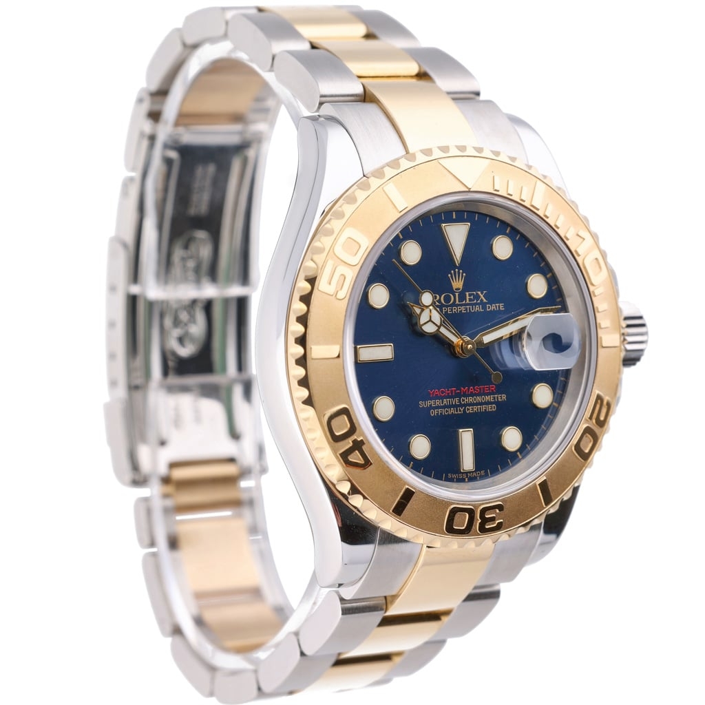 A Bi-Metal Rolex Yacht-Master Watch in stainless steel and 18ct yellow gold, presented here in the 35mm configuration with an 18ct yellow gold bezel and a striking blue dial. Its balanced proportions and rich colour contrast give this reference 168623 a distinctive presence, equally suited to everyday wear and more refined settings.
