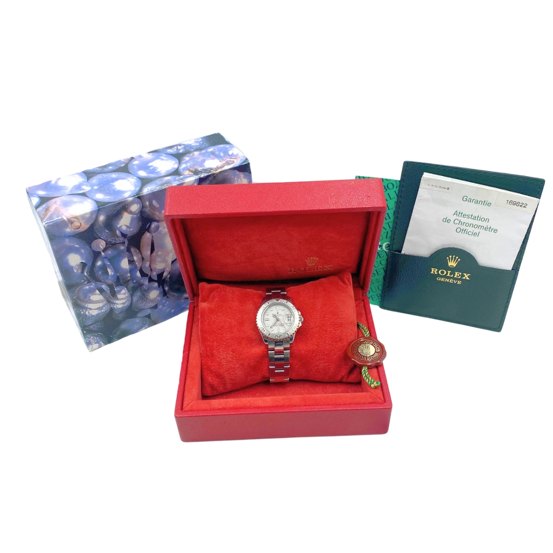 A Rolex Yacht-Master Watch, model 169622, presented in immaculate condition. This 2003 reference pairs stainless steel with a platinum bidirectional bezel and features a refined silver dial with raised hour markers and a red seconds hand. It features a balanced, elegant profile and is powered by the Rolex Calibre 2235 automatic movement. The watch is supplied with its original Rolex paperwork, presentation box, and a 12-month WLC warranty.
