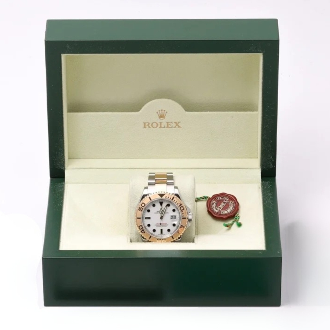 A Rolex Yacht-Master 16623 is presented in a bi-metal construction of stainless steel and 18ct yellow gold, paired with a clean white dial for excellent clarity. The 40mm Oyster case offers a balanced presence on the wrist, while the engraved yellow-gold bezel enhances its nautical character.