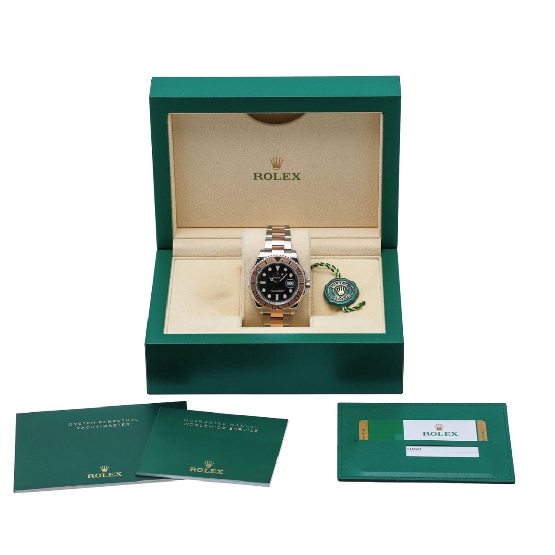 A Bi-Metal Rolex Yacht-Master Watch is a striking bi-metal Rolex Yacht-Master, model 116621, presented in stainless steel and 18ct Everose gold, showcasing the perfect balance of sport and refinement. The 40mm case is complemented by the signature Everose gold bidirectional rotatable bezel with raised numerals, framing a rich black dial that delivers exceptional clarity and contrast. Luminous hour markers and Mercedes hands ensure legibility in all conditions, while the date display at 3 o’clock, magnified by the Cyclops lens, adds everyday practicality to this highly versatile timepiece.