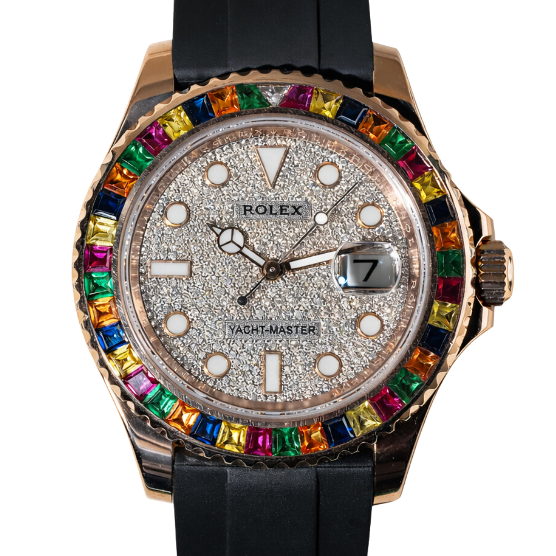A Rolex Yacht-Master 40 Watch, Black Rubber Strap with 18ct Rose Gold Case & Clasp and a Custom Rainbow Bezel and Custom Diamond Dial.