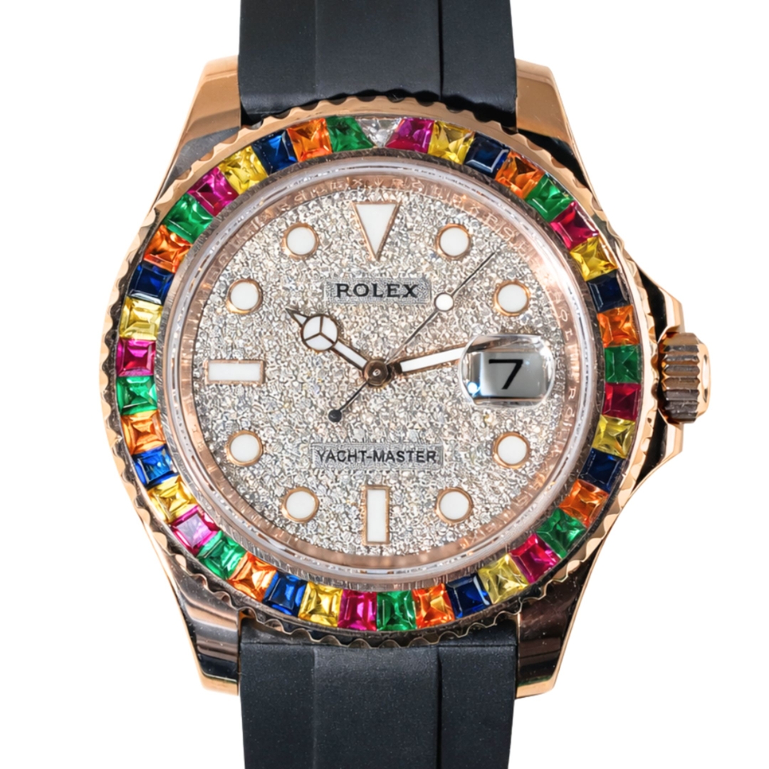 A Rolex Yacht-Master 40 Watch, Black Rubber Strap with 18ct Rose Gold Case & Clasp and a Custom Rainbow Bezel and Custom Diamond Dial.