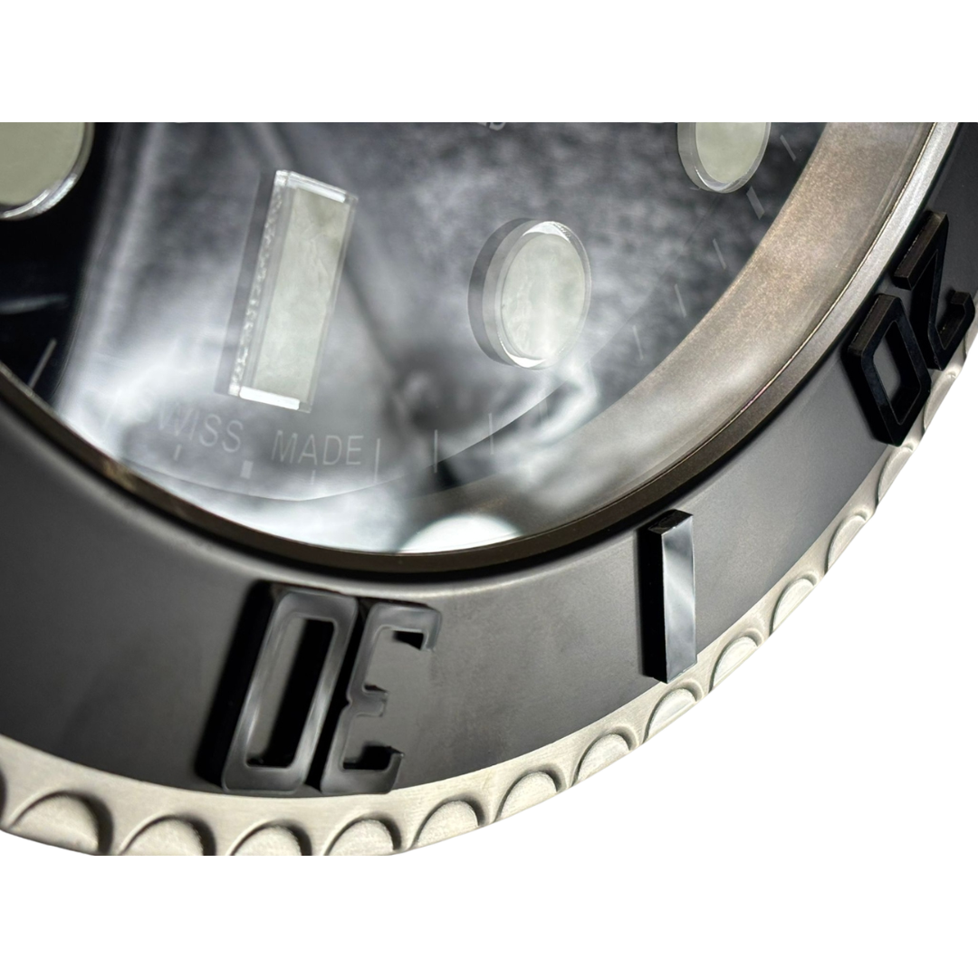 A stainless steel replica Rolex Yacht-Master Wall Clock in a classic black and silver finish. Measuring approximately 14 inches in height and width, this commanding timepiece channels the seafaring spirit of one of Rolex’s most iconic nautical designs.