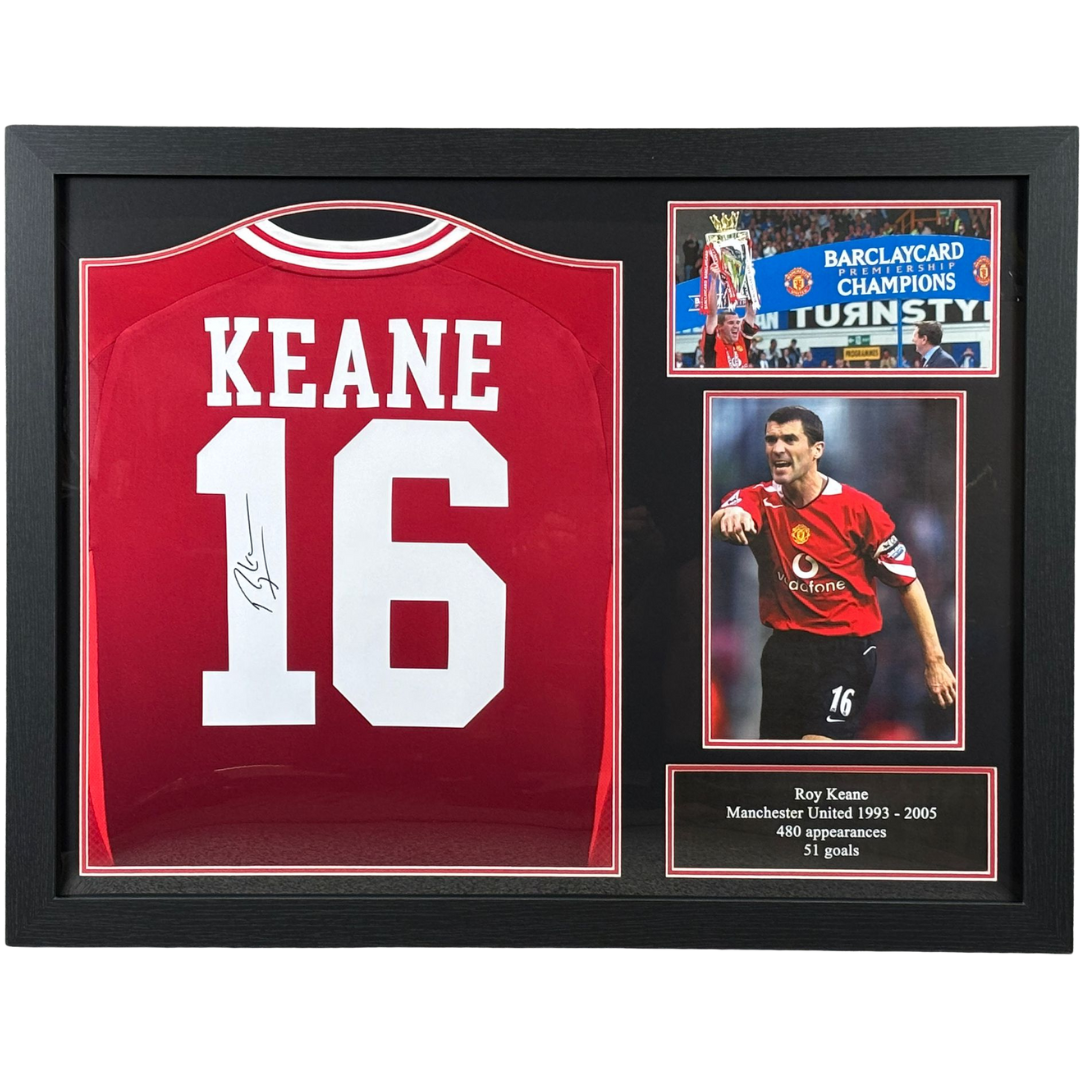 A signed and authenticated Roy Keane Manchester United shirt, beautifully displayed within a premium black frame. Measuring approximately 67cm in height and 87cm in width, it makes an impressive statement piece for any football fan or collector.