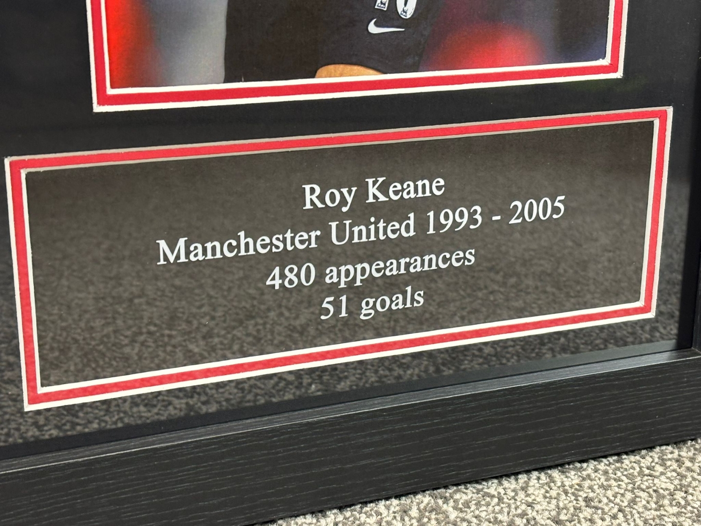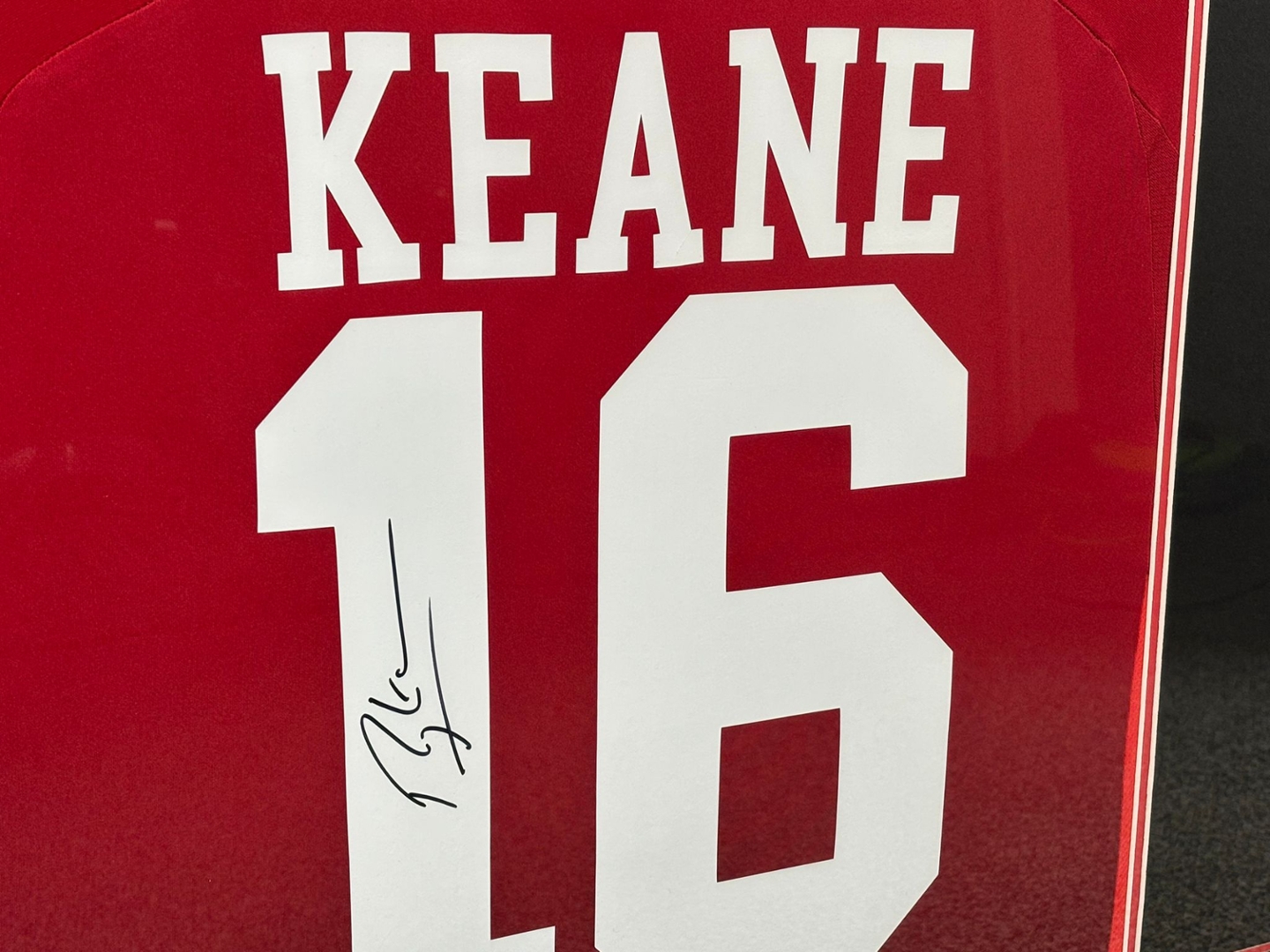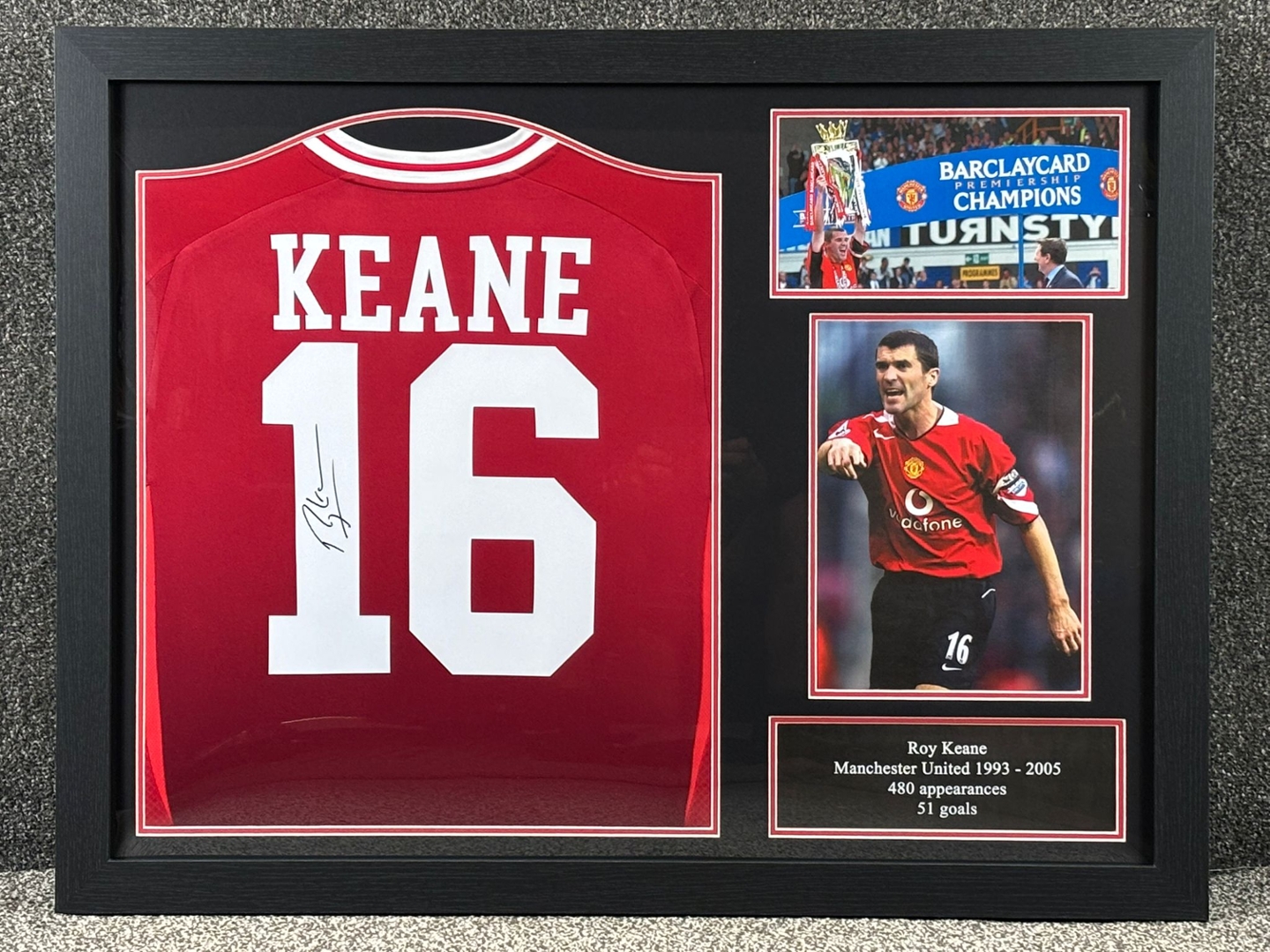 The iconic red number 16 shirt, personally signed by Roy Keane, is accompanied by dynamic imagery celebrating his time as Manchester United’s captain and midfield powerhouse. A plaque beneath the shirt details his remarkable career with the club from 1993 to 2005, including 480 appearances and 51 goals.