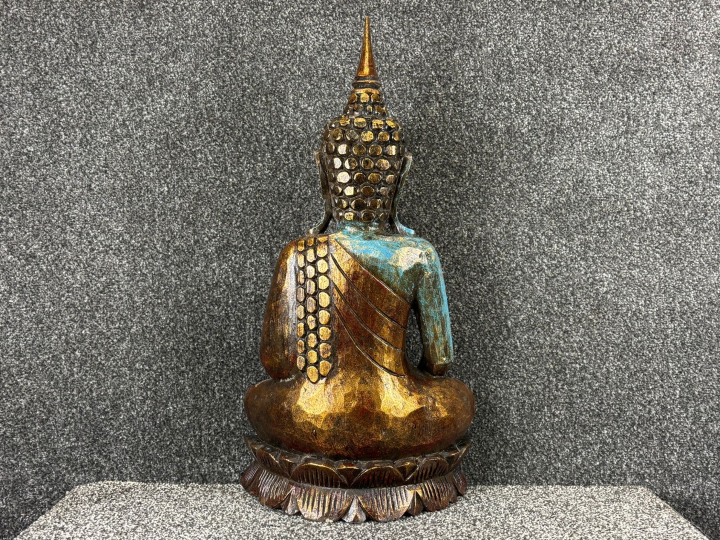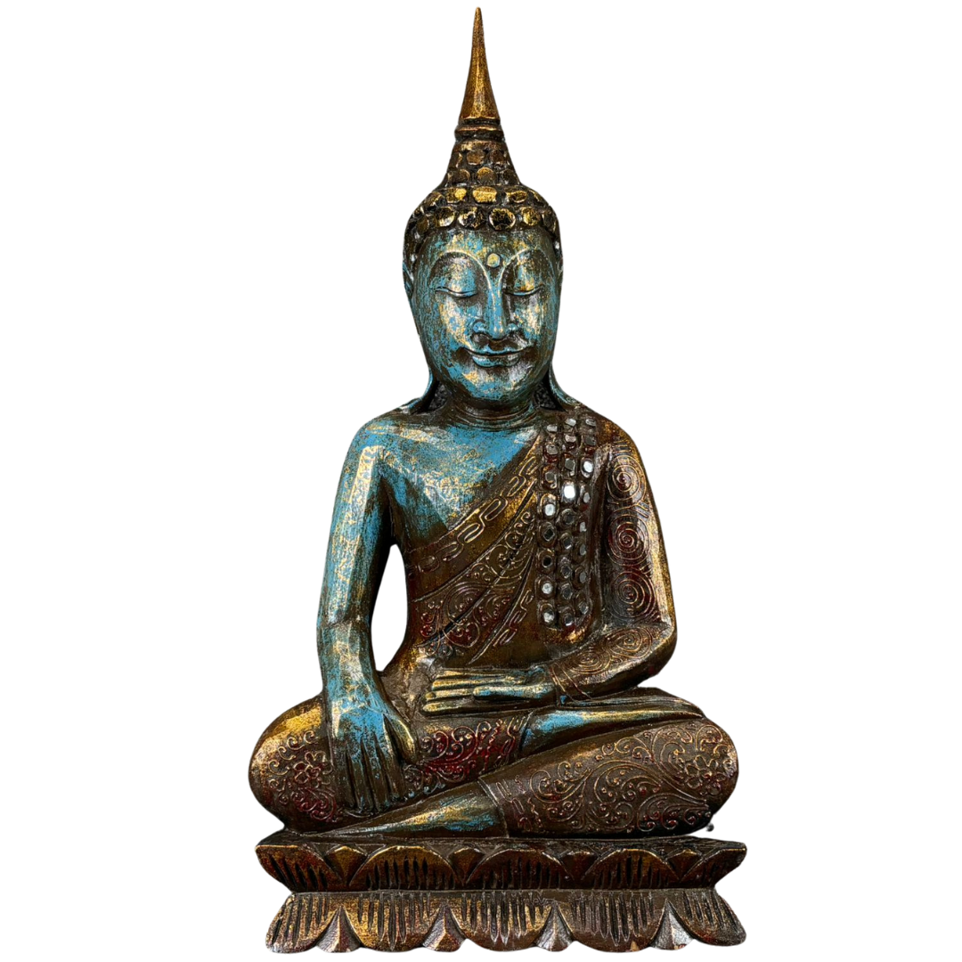Depicted in a traditional seated pose, the Buddha’s serene expression radiates calm and balance. The rich blue tones are beautifully complemented by gold and bronze accents, highlighting the intricate carvings and detailed robe patterns. Subtle embellishments add a touch of refinement, giving the sculpture a timeless and graceful presence.