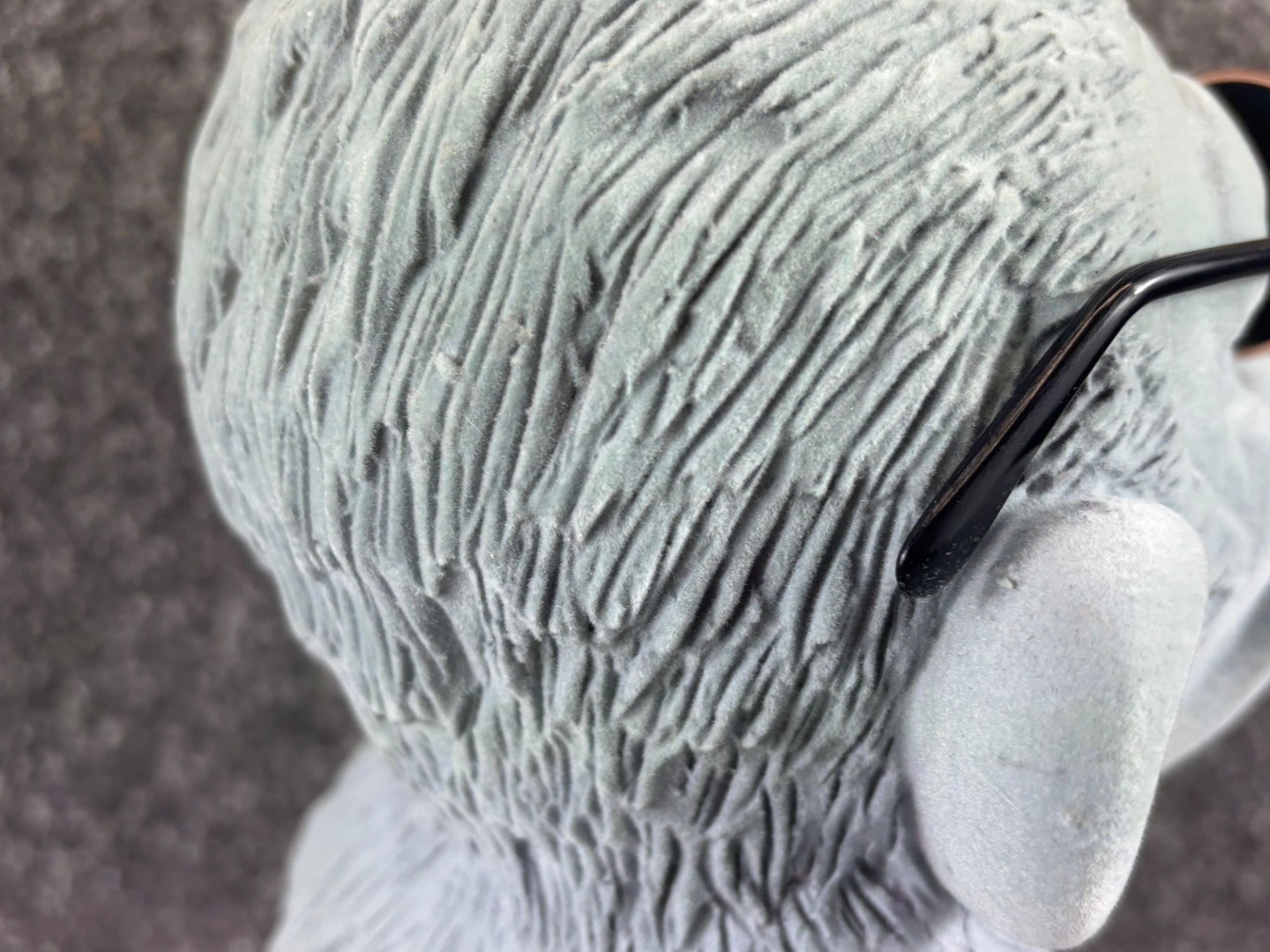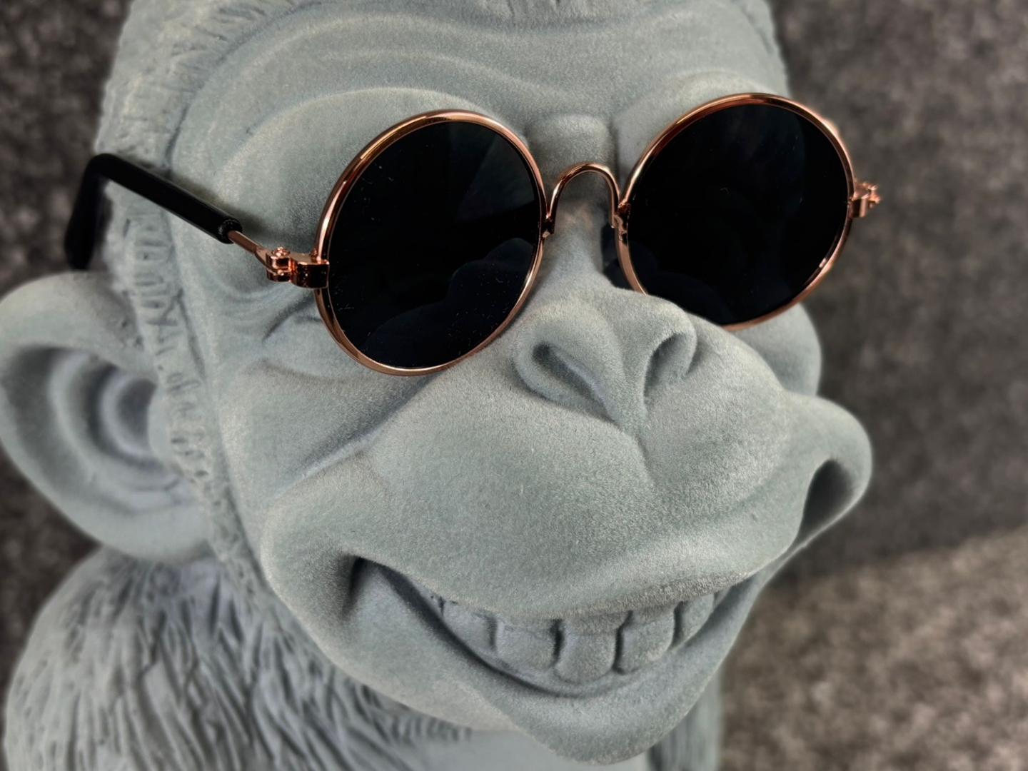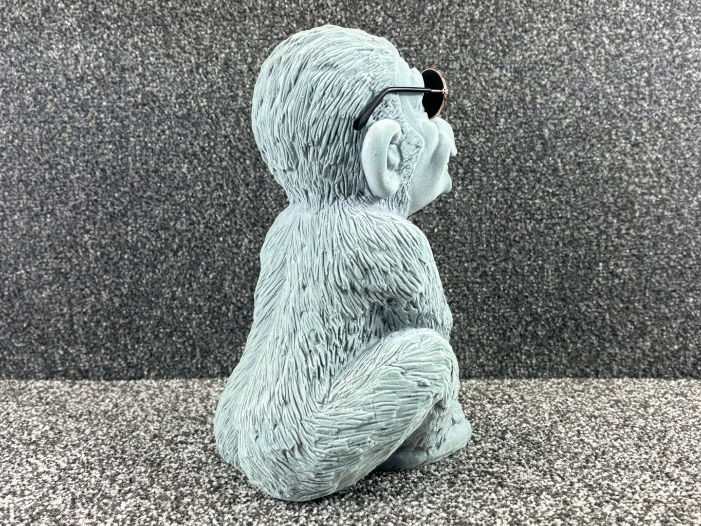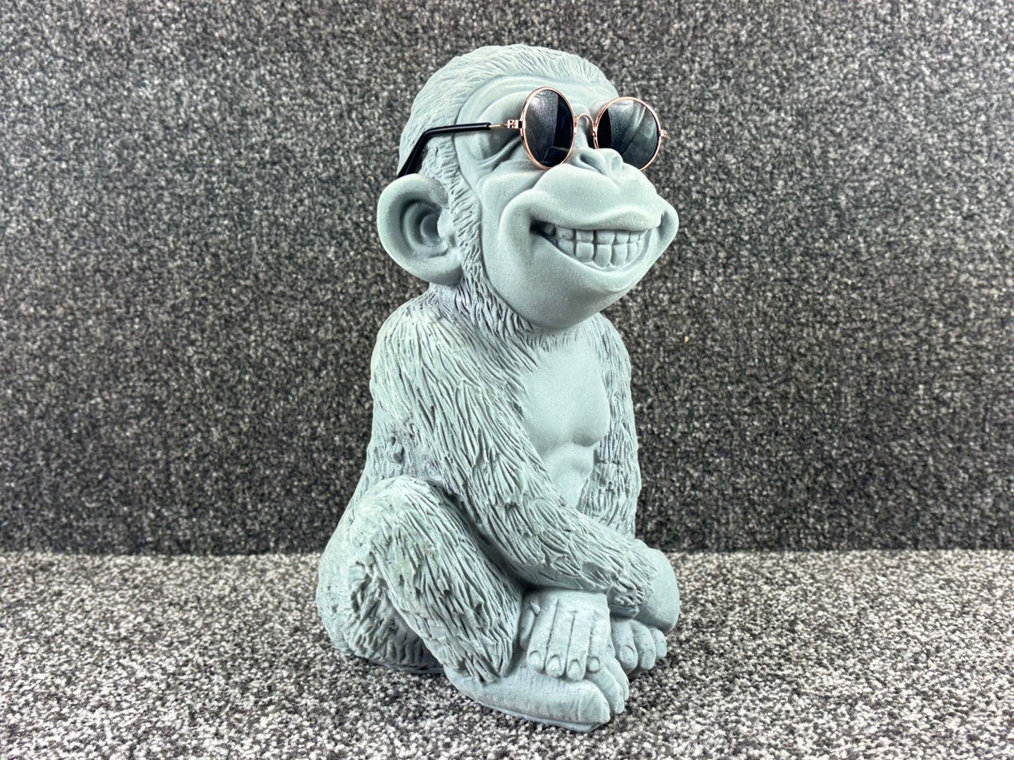 A grey sculpture of a chimp with shades that captures charm, humour, and modern style in one piece. This detailed sculpture features a seated chimpanzee with a wide, toothy grin, brought to life with textured fur and realistic features. What makes this piece stand out is the addition of sleek round sunglasses, giving the chimp a cool, contemporary edge that makes it perfect for quirky interiors.