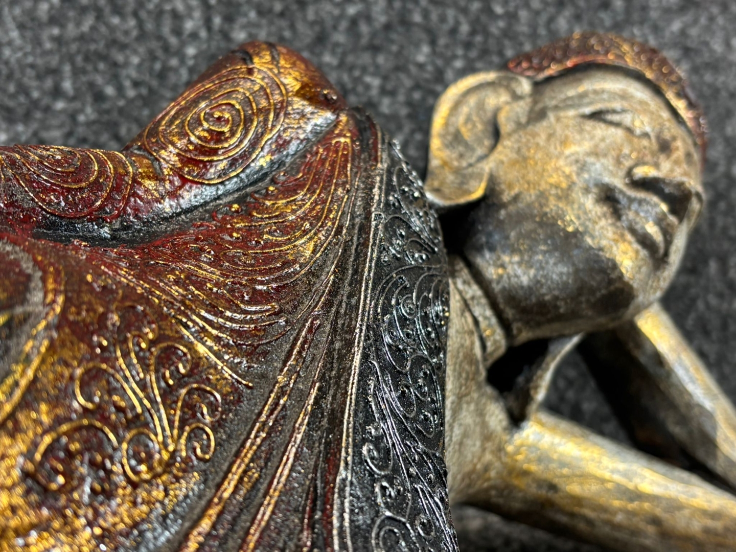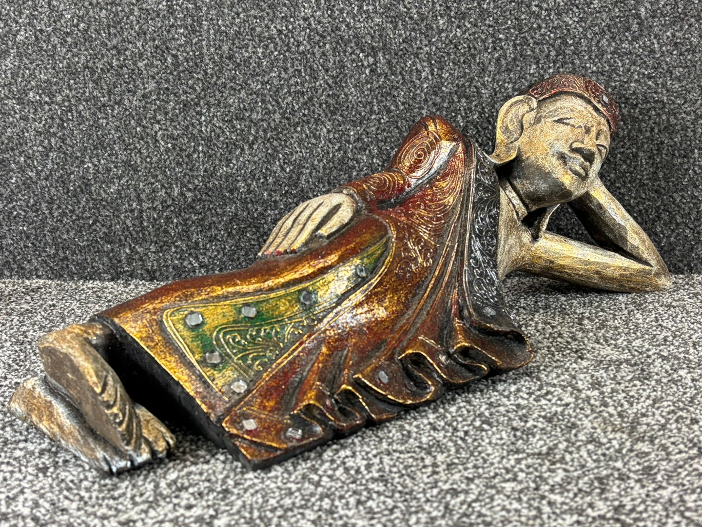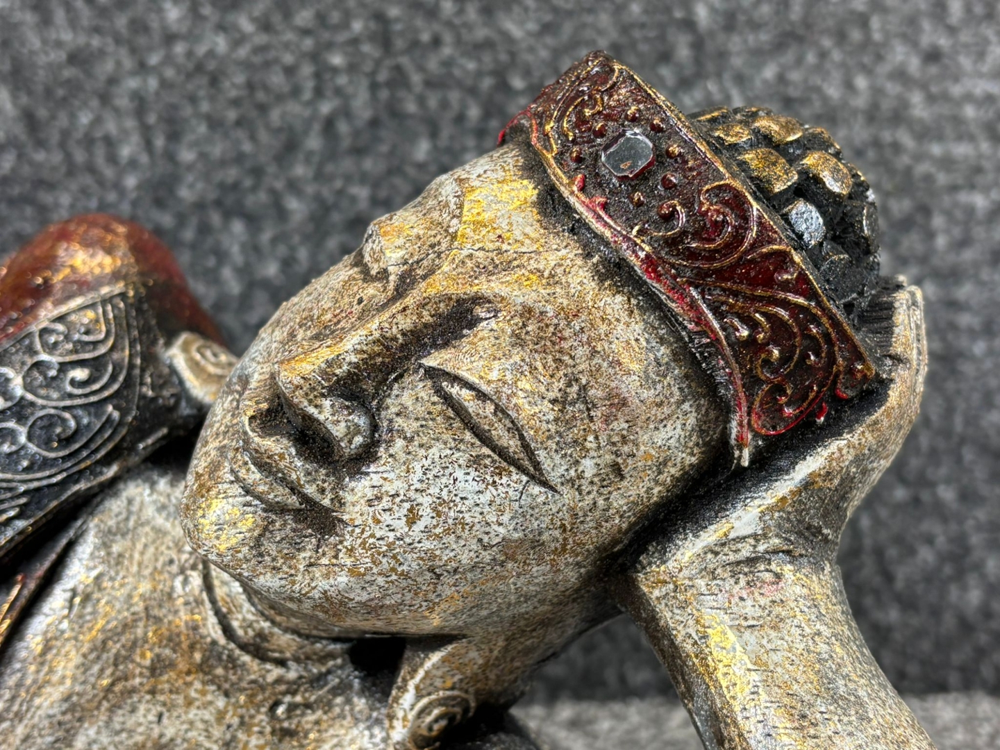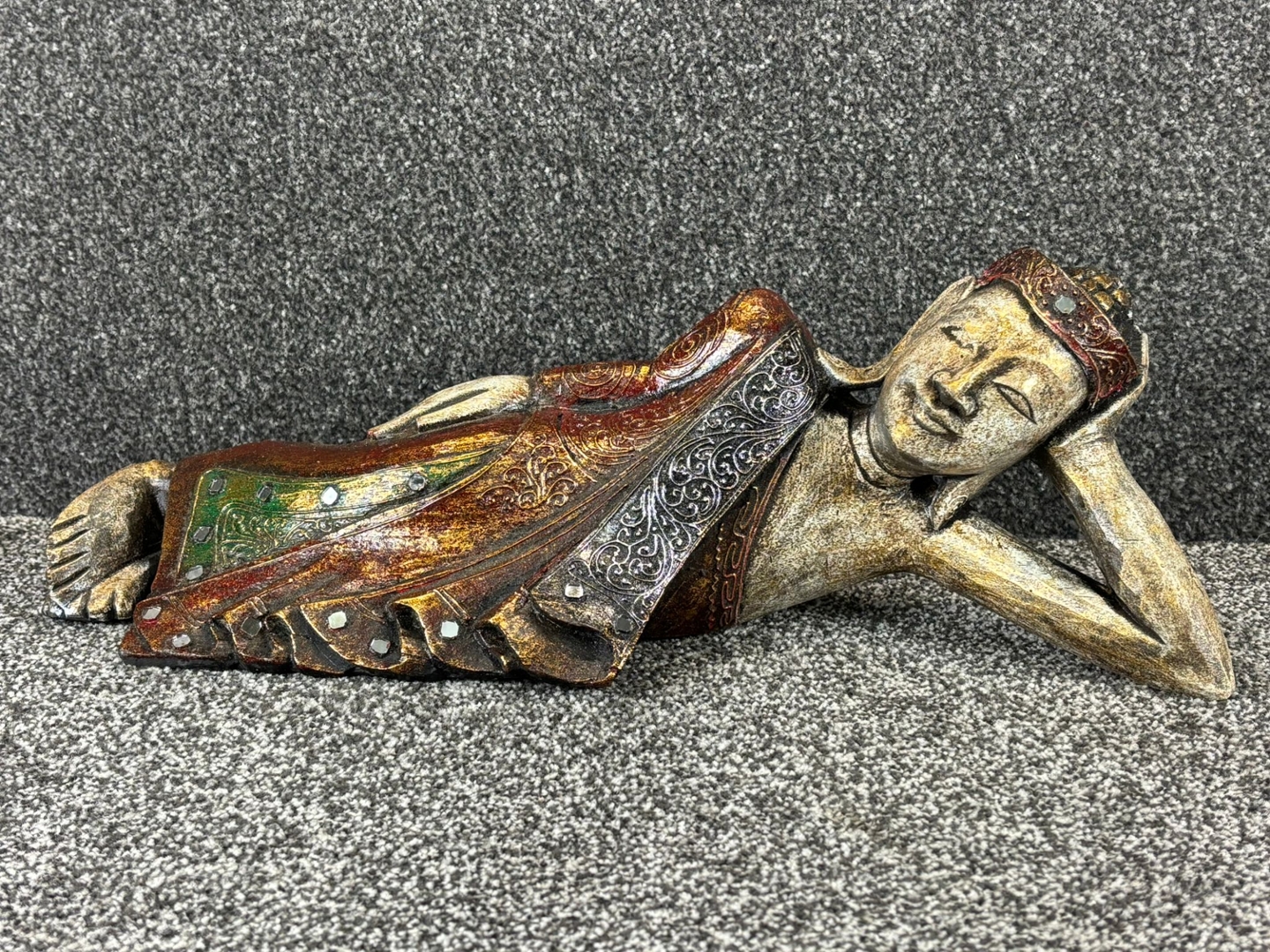 The Buddha is portrayed in a tranquil reclining position, symbolising the moment of enlightenment and inner peace. The gold finish is enhanced with rich tones of red and green, highlighting the intricate detailing of the robe and the refined craftsmanship of the figure. Subtle embellishments add an extra touch of sophistication, bringing depth and texture to the design.