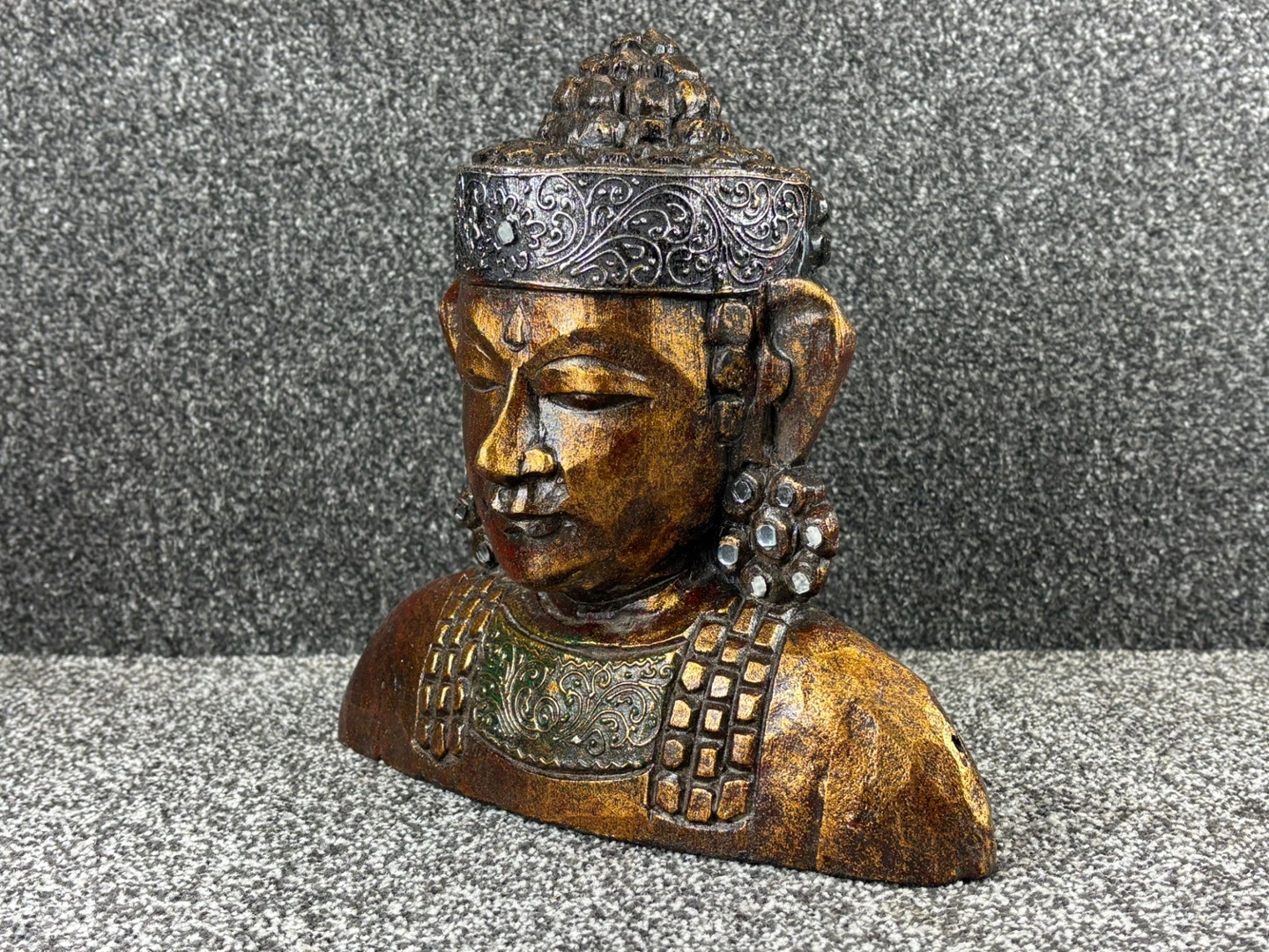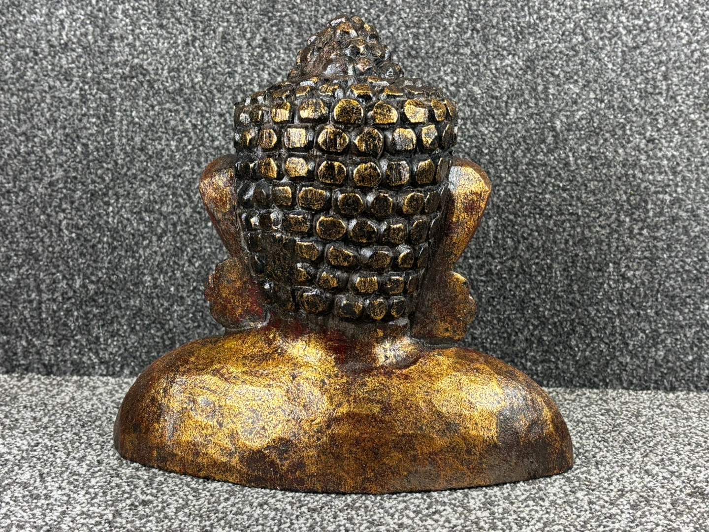 A sculpture of a Large Gold Buddha Head. Approx 32cm height, 32cm width, 15cm depth.
