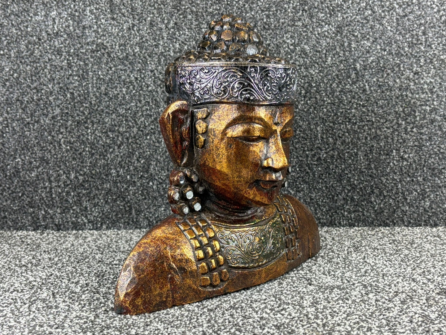 The sculpture features finely carved detailing, with a serene facial expression that embodies mindfulness and enlightenment. Its rich gold and bronze tones are beautifully complemented by ornate patterns on the headpiece and necklace, while the subtle gemstone accents add a refined touch of luxury and depth.