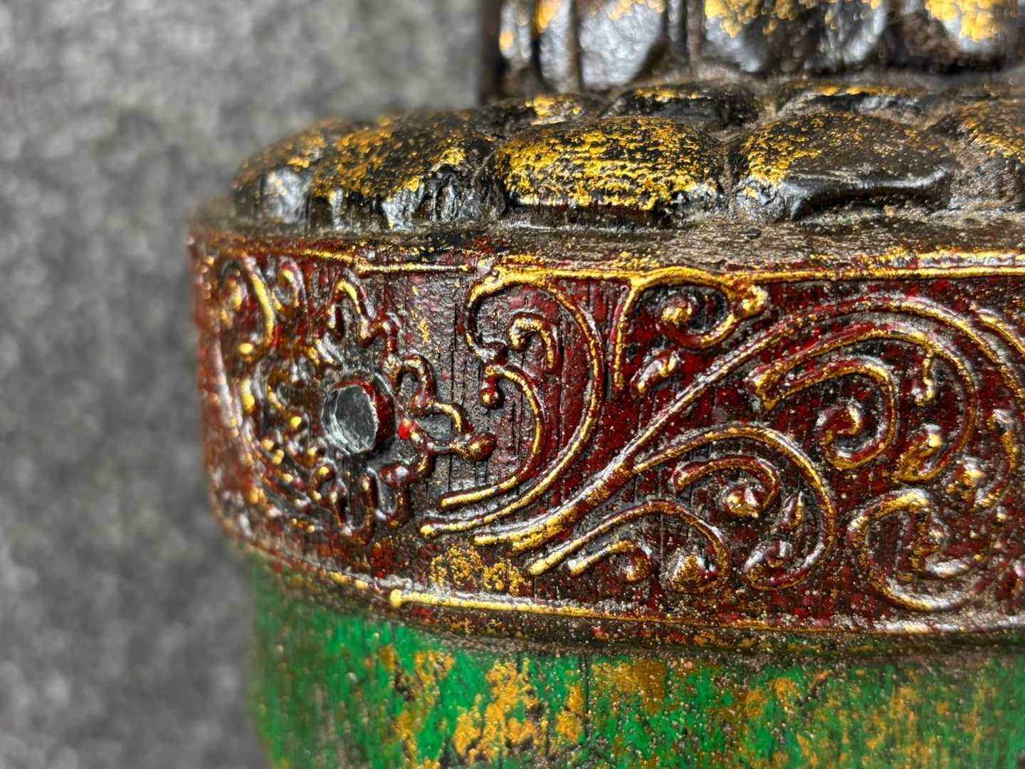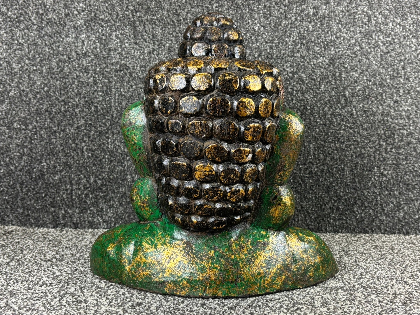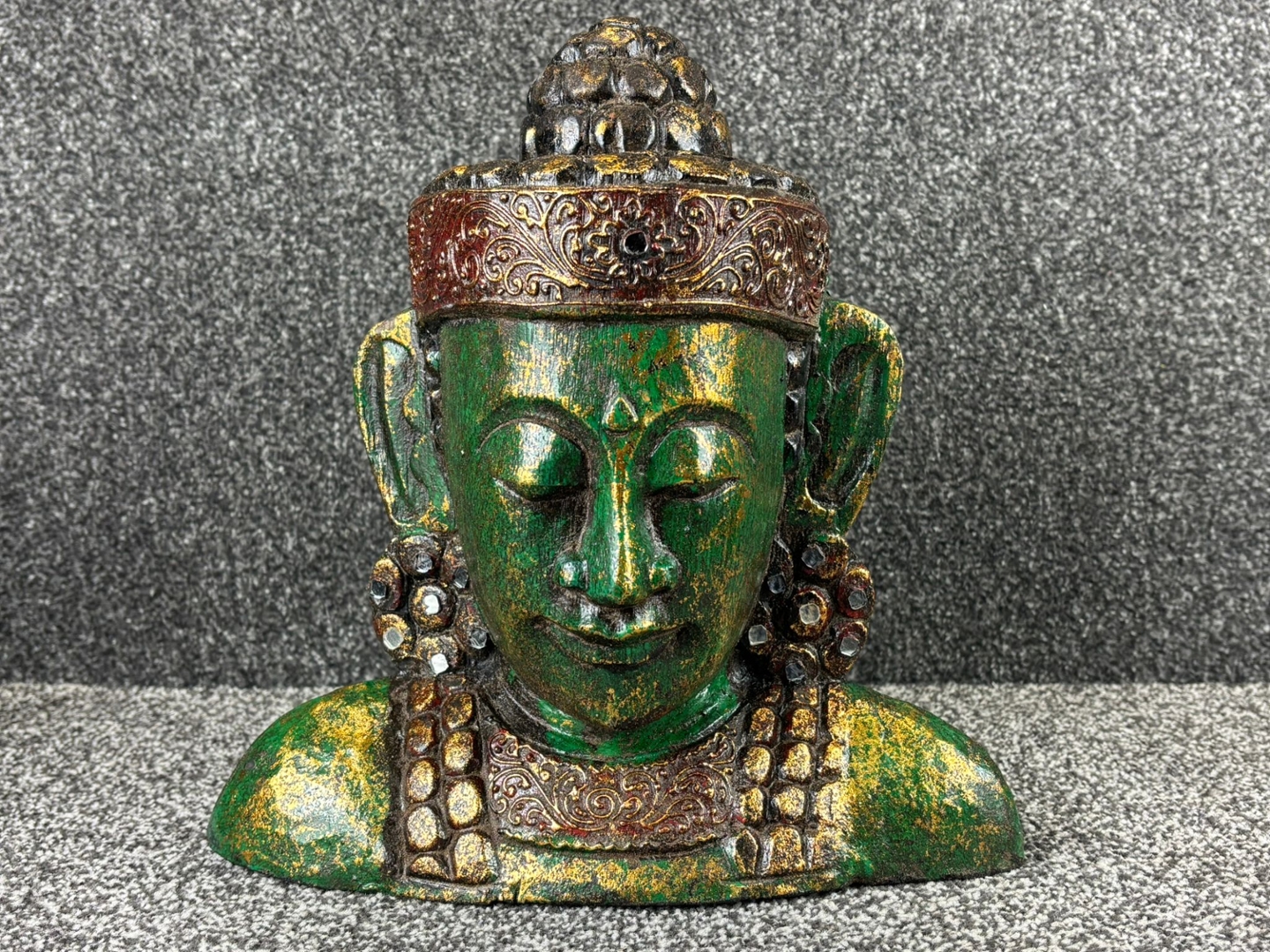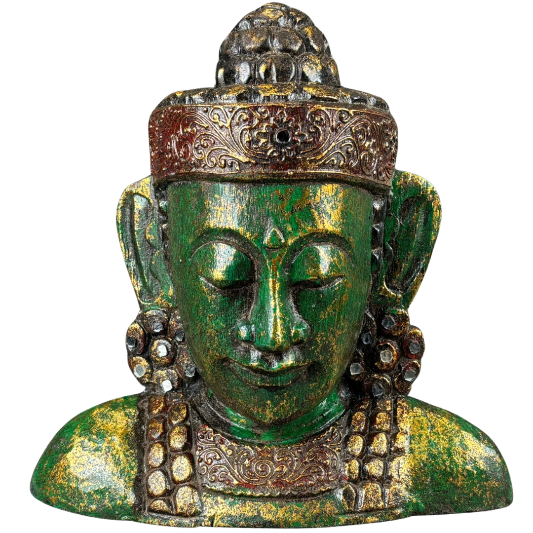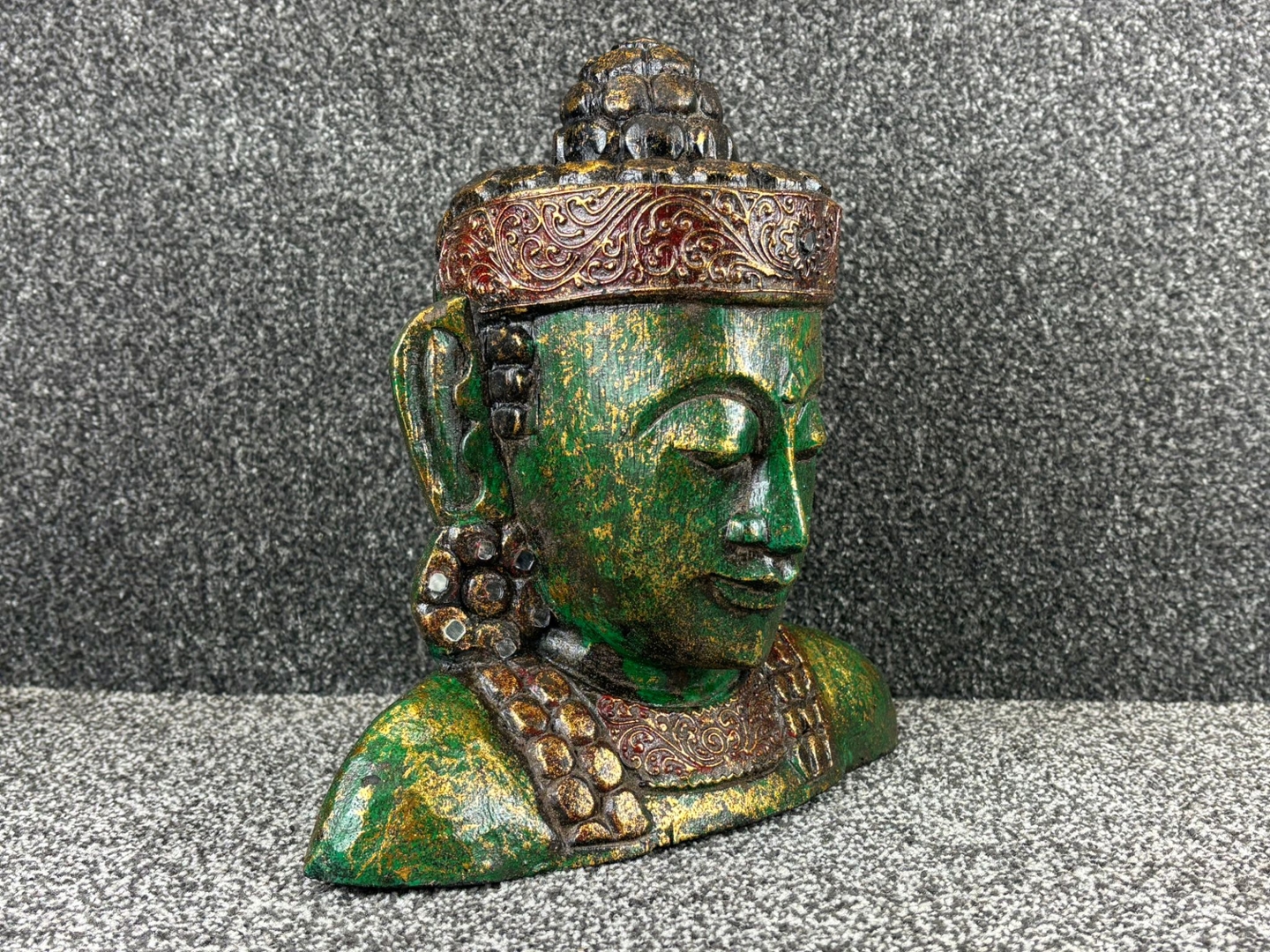 The sculpture features a beautifully detailed design, with a serene facial expression and ornate embellishments throughout. Its rich green and gold tones create a vibrant yet calming aesthetic, enhanced by the intricate carvings on the headband and necklace. The subtle aged finish adds depth and character, evoking a timeless sense of wisdom and tranquillity.