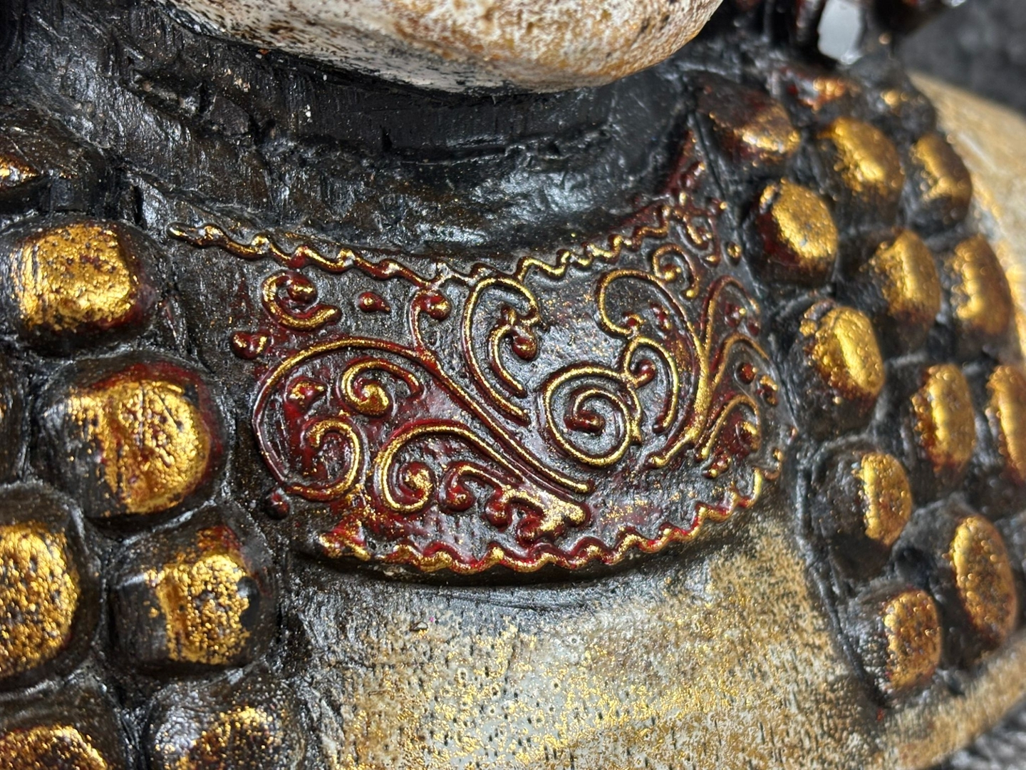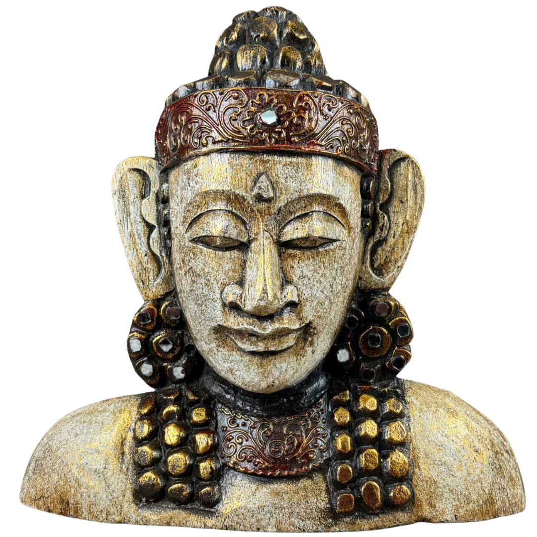 The sculpture features intricate detailing throughout, from the textured curls of the hair to the finely carved facial features that exude calm and contemplation. Accented with subtle gold and bronze tones, the design highlights the Buddha’s peaceful expression and ornate headpiece, creating a sense of timeless elegance and spiritual depth.