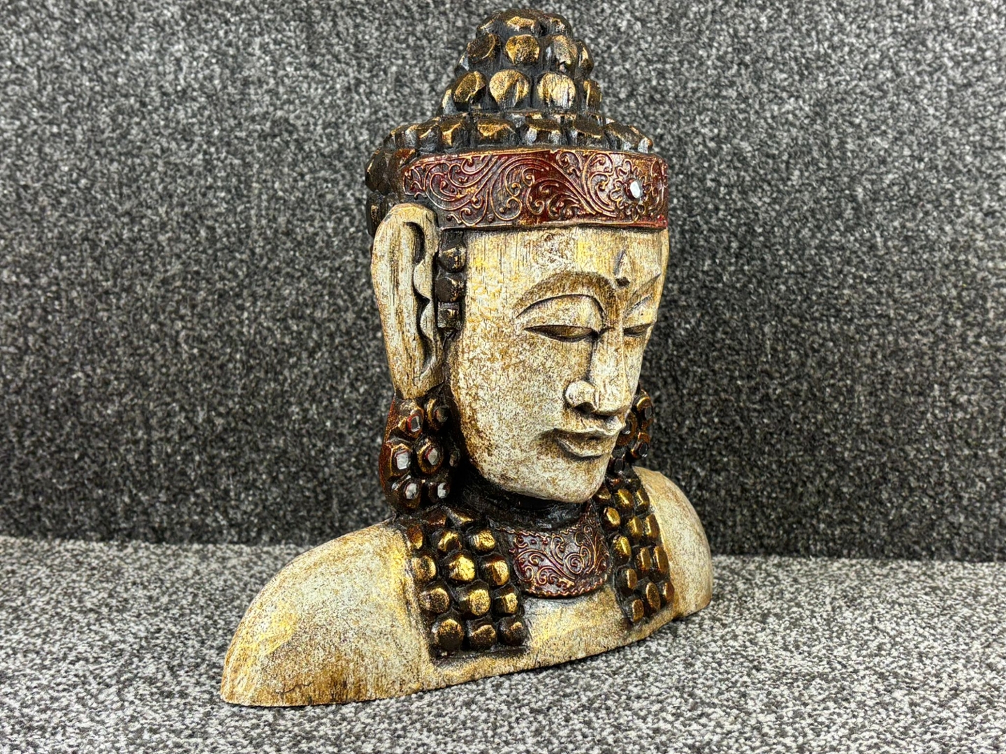 Perfect for display in a living space, meditation room, or garden area, this Buddha Head symbolises mindfulness, enlightenment, and inner harmony. Its refined craftsmanship and tranquil aura make it an inspiring addition to any collection, radiating peace and balance wherever it is placed.