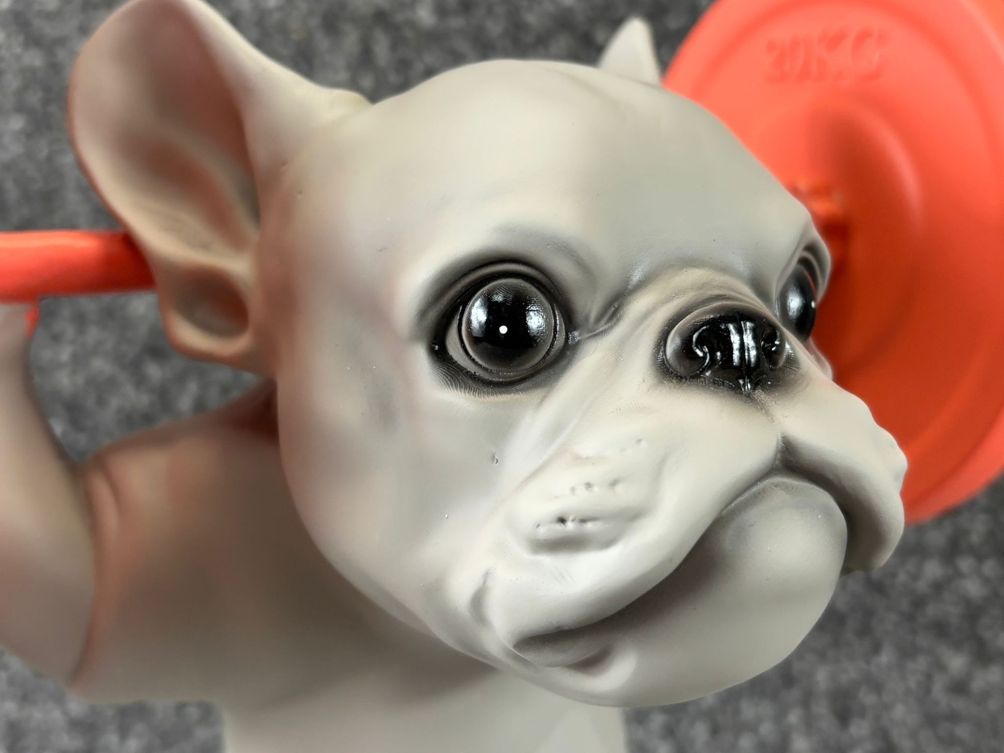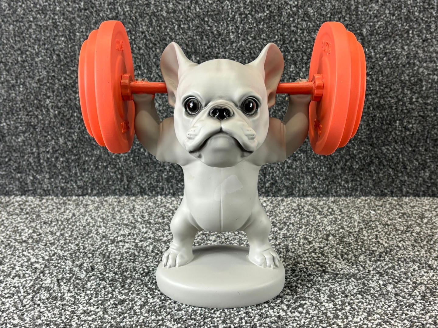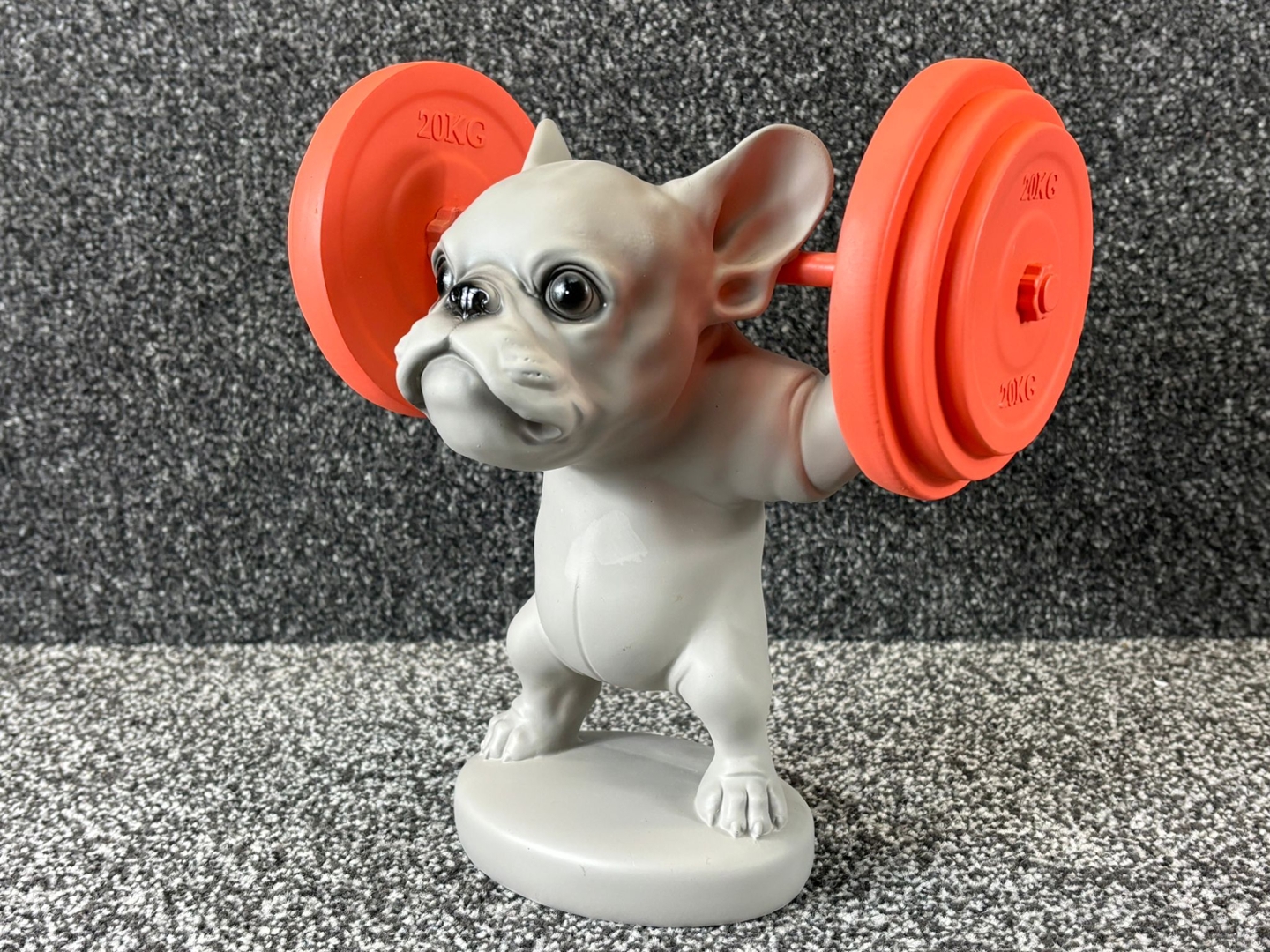 A sculpture of a Weight Lifting French Bulldog. Approx 26cm height, 25cm width, 15cm depth.
