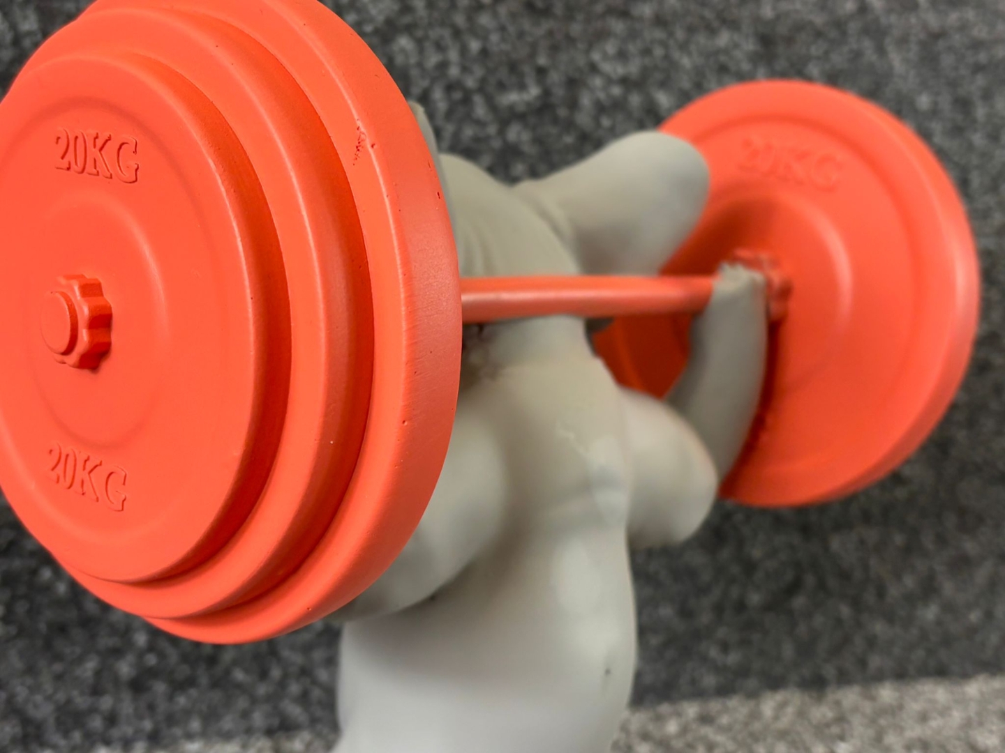 A sculpture of a weight lifting French Bulldog that blends humour, strength, and charm into one eye-catching design. This playful piece depicts a determined French Bulldog holding a barbell with oversized red 20kg plates, creating a fun contrast between the dog’s small stature and the heavy weights. The smooth white finish of the bulldog, paired with the bold pop of colour from the weights, makes it a standout decorative piece full of personality.