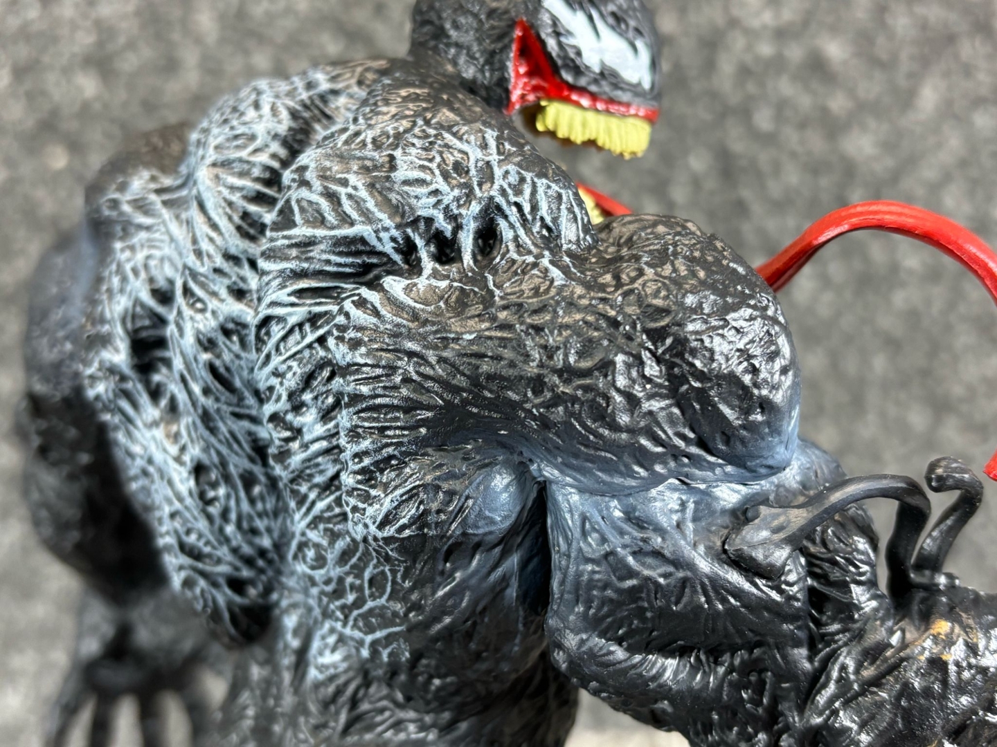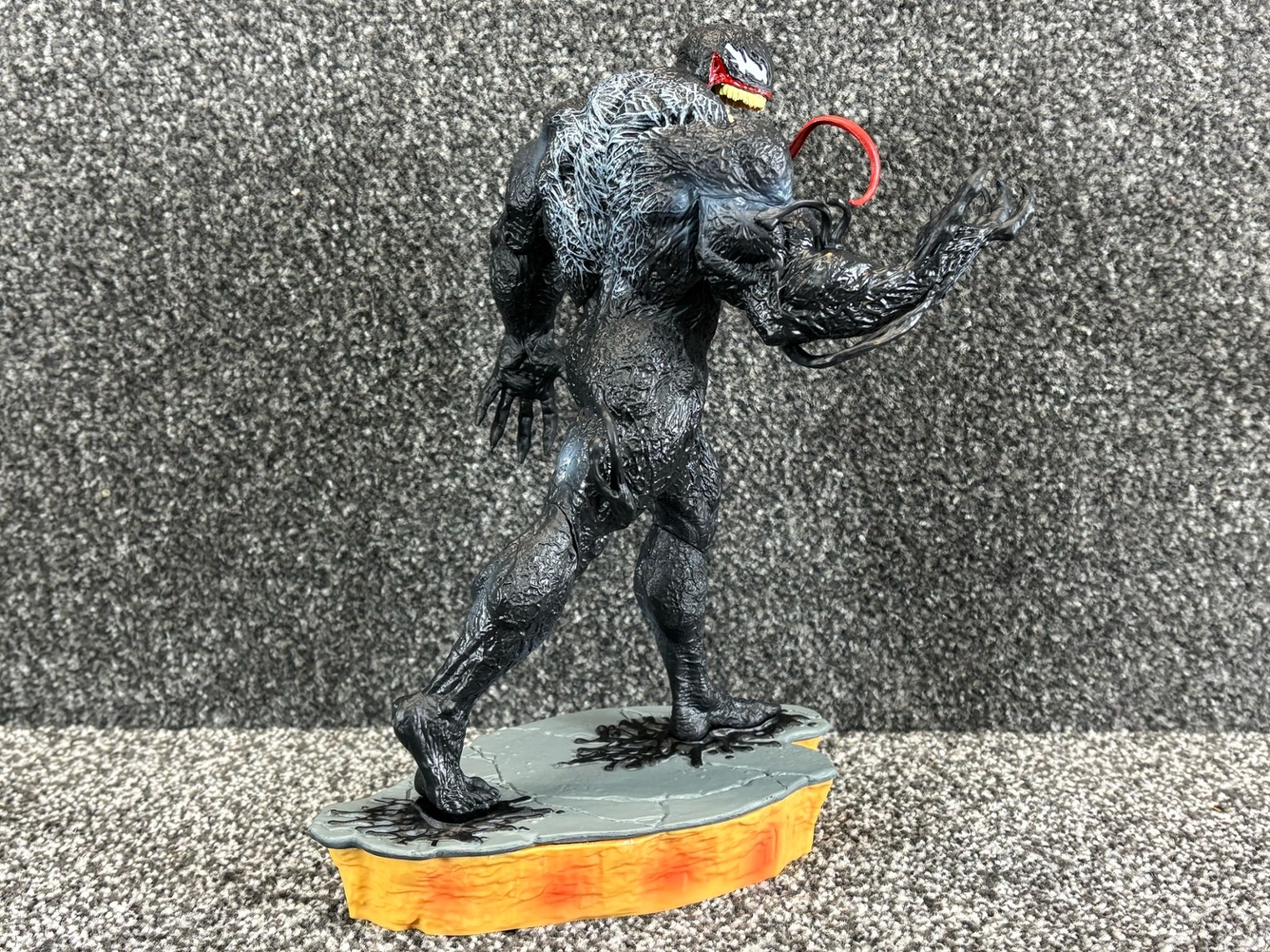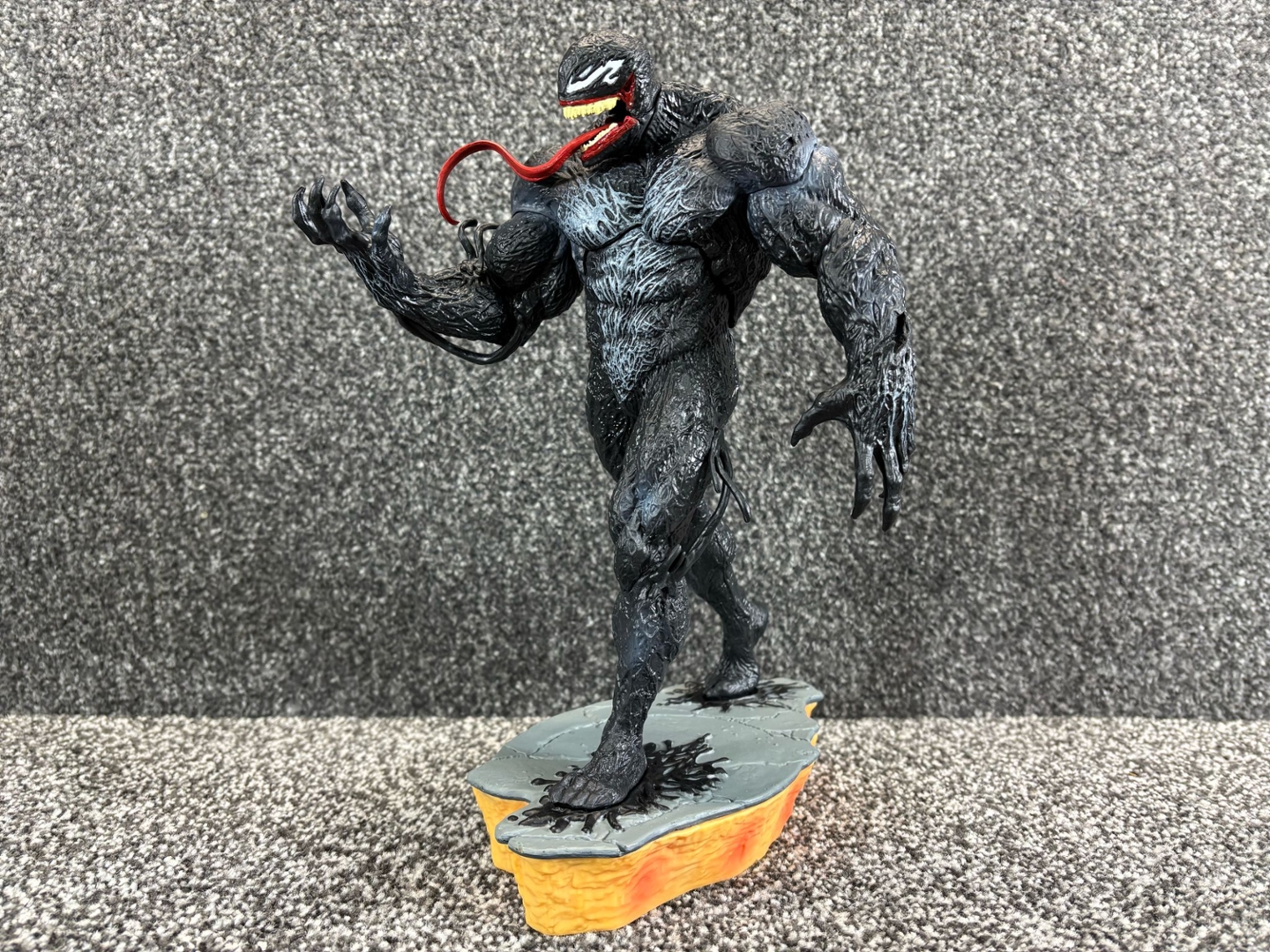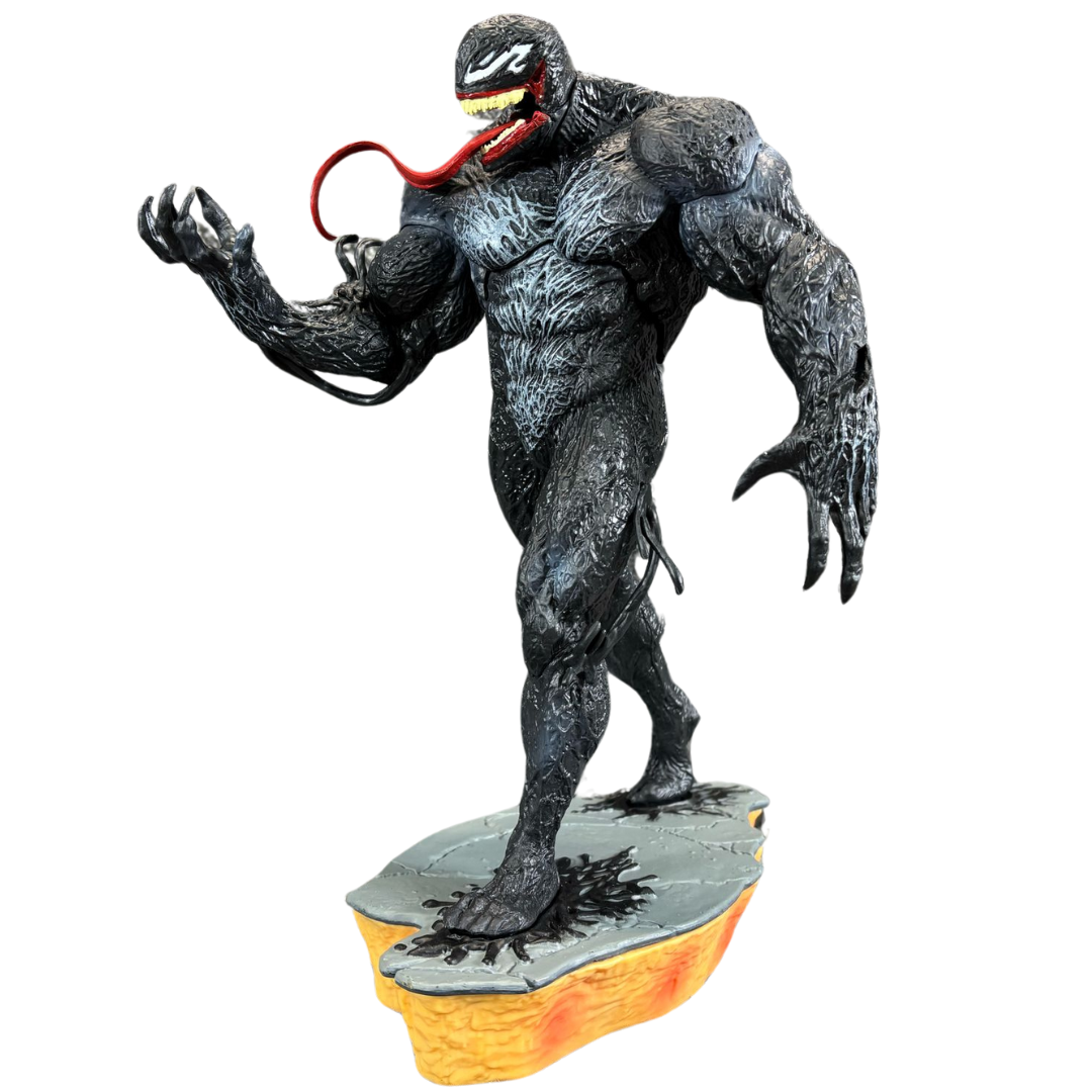 The texture of Venom’s muscular form is intricately detailed, giving the black, sinewy suit a lifelike, alien feel. His wide, toothy grin and serpent-like tongue curl outward in classic Venom fashion, while his base—designed to look like a cracked, molten platform—amplifies the menacing energy of this dark protector.