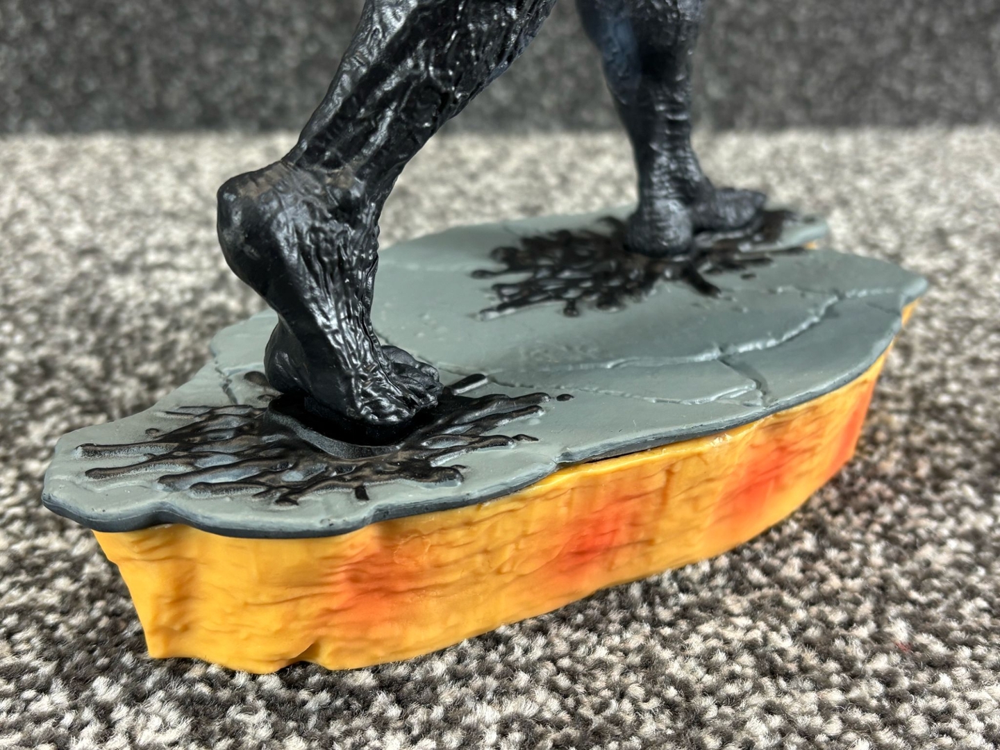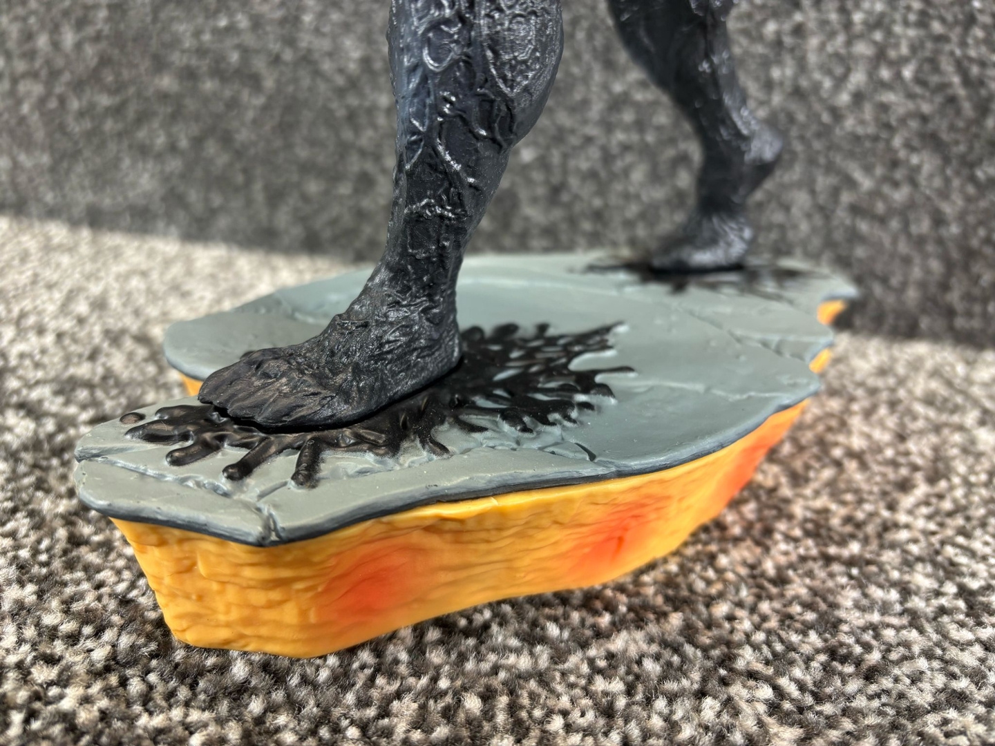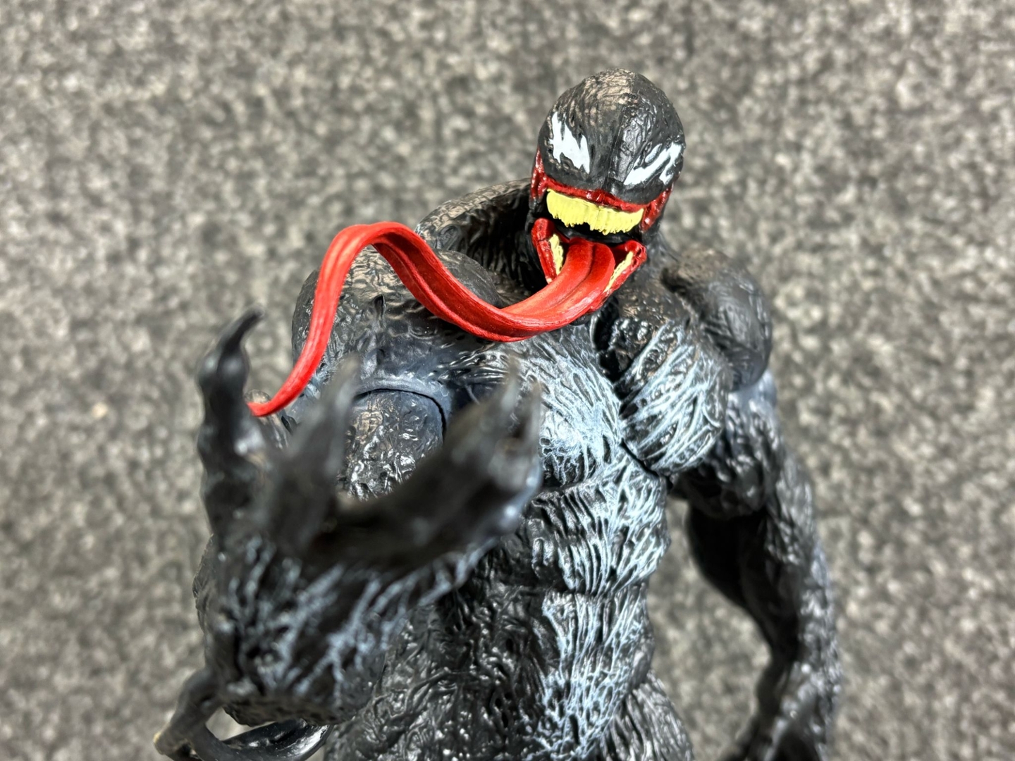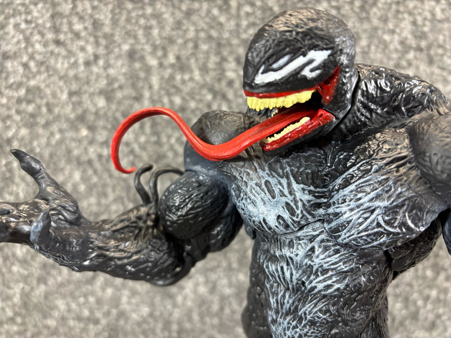 The texture of Venom’s muscular form is intricately detailed, giving the black, sinewy suit a lifelike, alien feel. His wide, toothy grin and serpent-like tongue curl outward in classic Venom fashion, while his base—designed to look like a cracked, molten platform—amplifies the menacing energy of this dark protector.