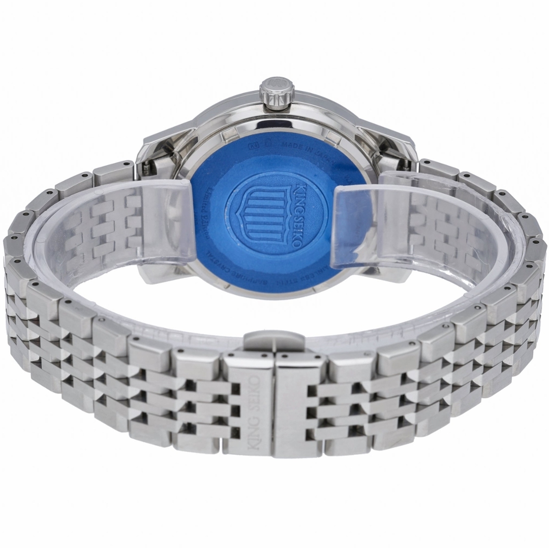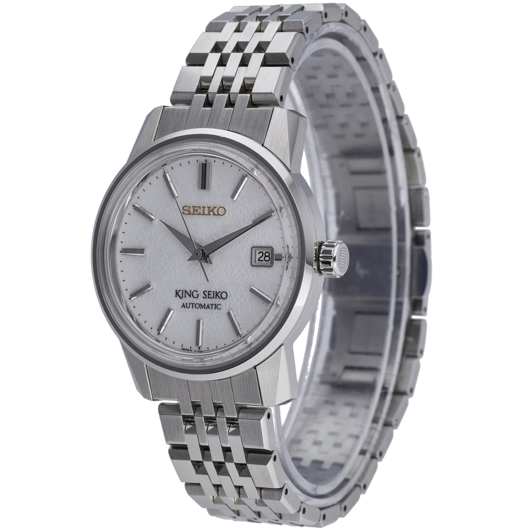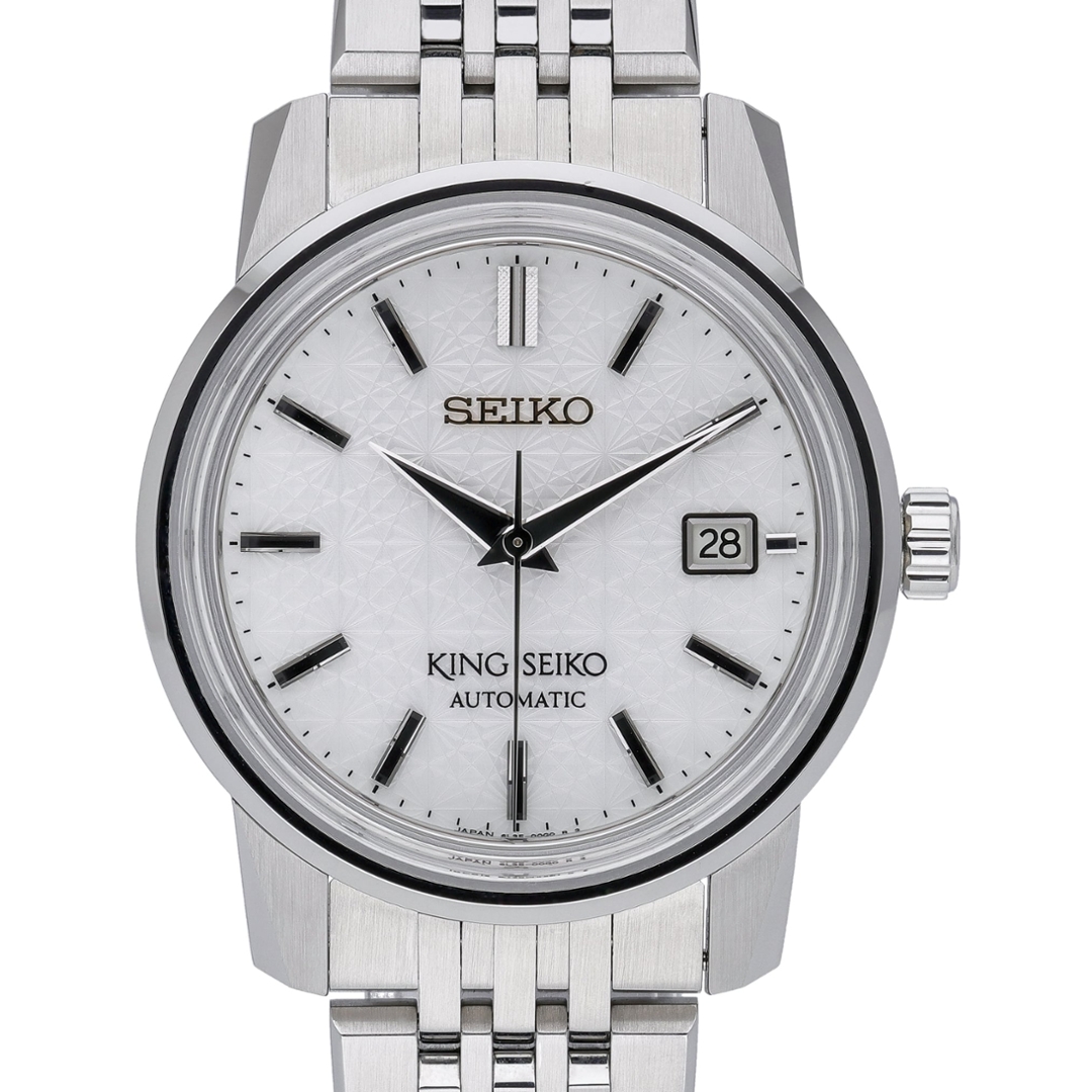 A Seiko King Seiko Watch, reference SJE095J1, presented in immaculate condition, showcases the refined and sharply executed design language of the revived King Seiko line. The 38mm stainless steel case features crisp lines and a well-balanced profile, paired with a matching bracelet that enhances its clean and structured aesthetic. The white dial features a subtle geometric pattern, adding depth and texture while maintaining a highly legible and understated appearance.